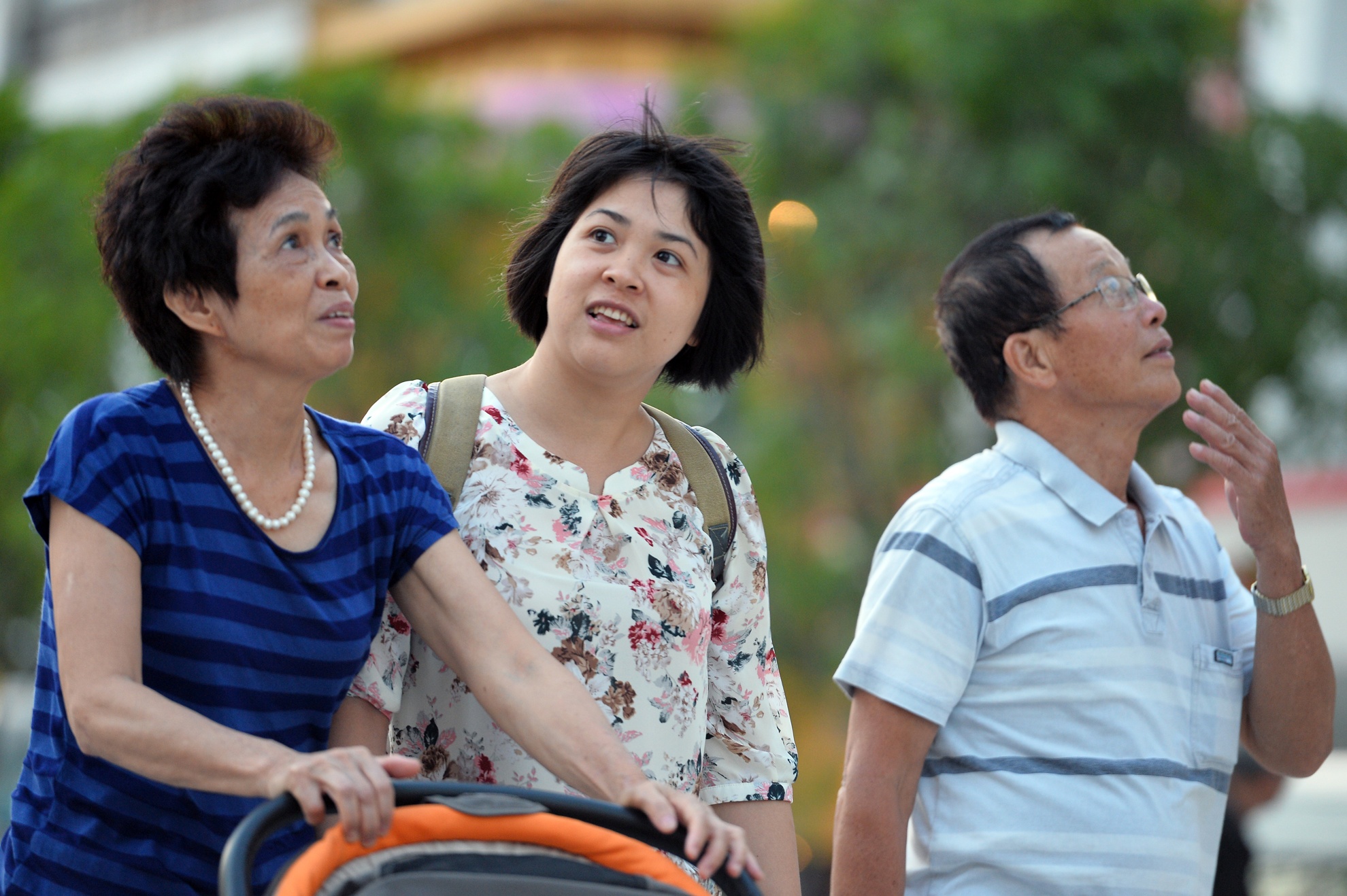 Một gia đình từ quận Gò Vấp đẩy xe đưa em bé đi dạo.