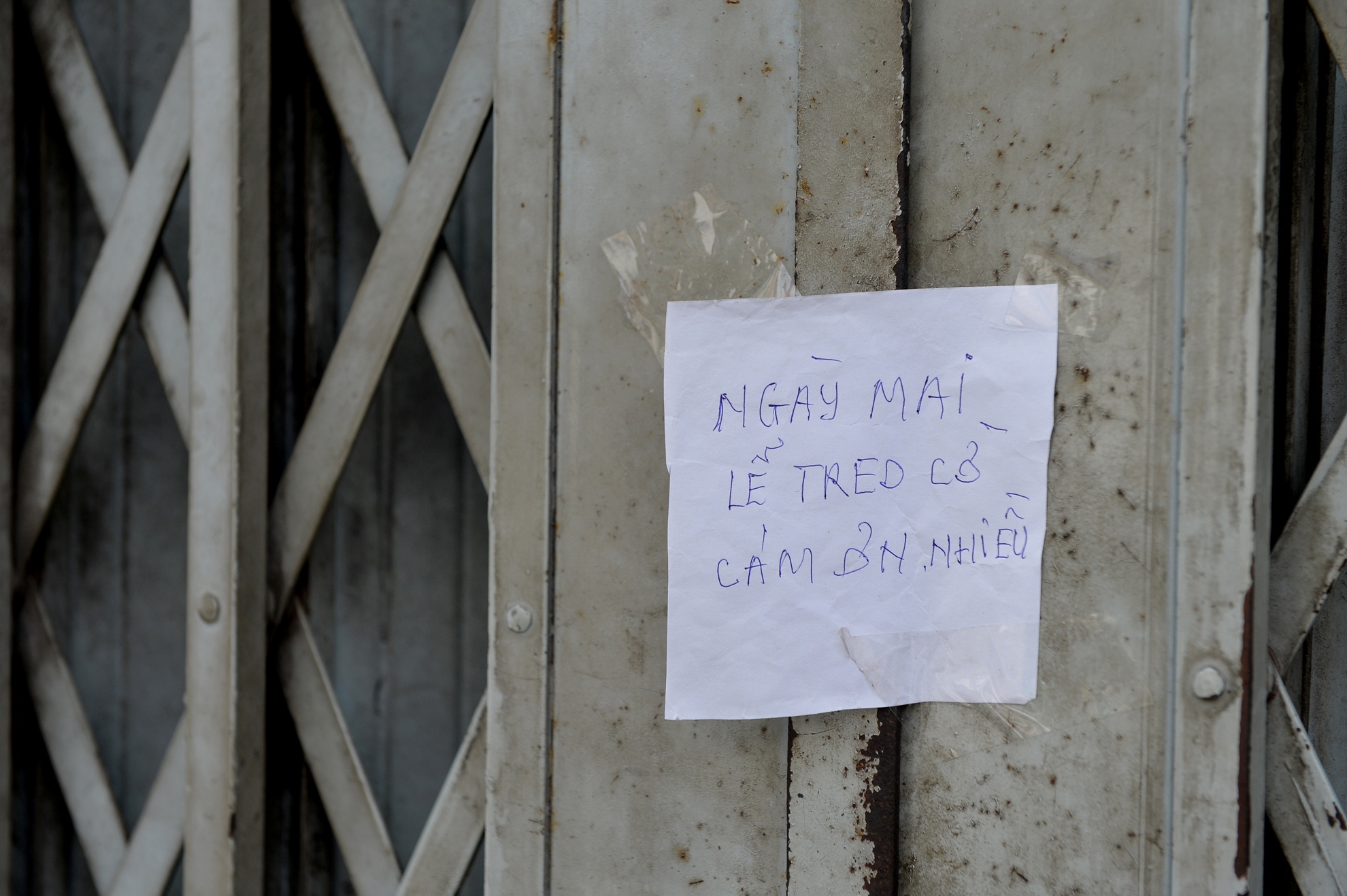 | Một số hộ gia đình được dán giấy nhắn nhủ treo cờ vào ngày 30/4 trước cửa nhà. |