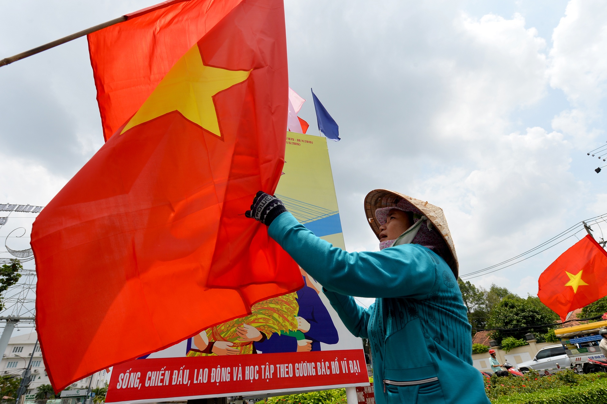 Người phụ nữ quê Ninh Bình tranh thủ bán cờ kiếm thêm, mỗi lá có giá 50.000 đồng.