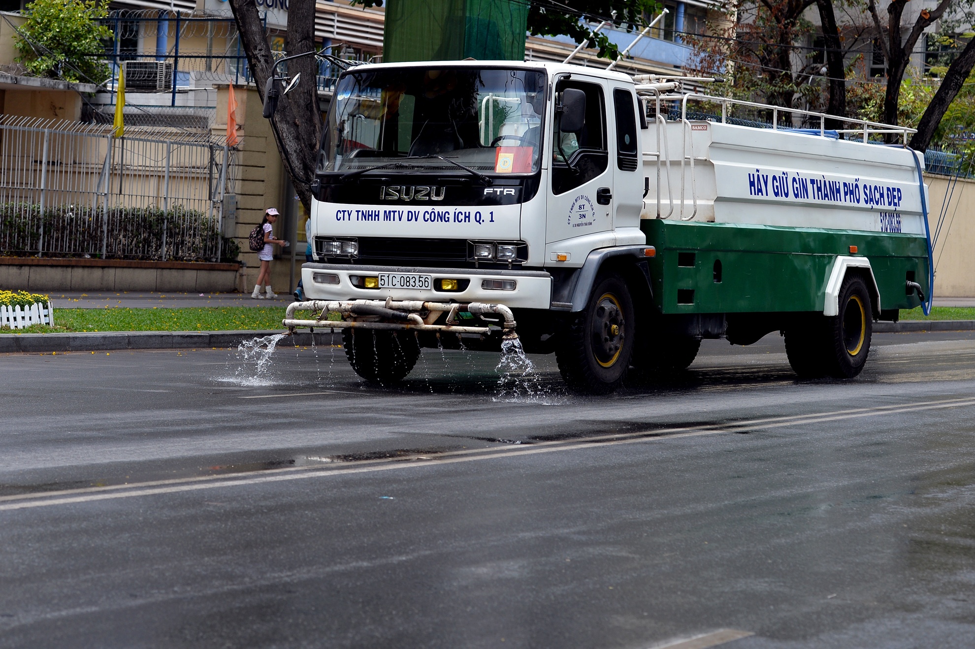 | Xe rửa đường liên tục hoạt động tại khu vực sẽ diễn ra lễ diễu binh, diễu hành trên đường Lê Duẩn, quận 1. |