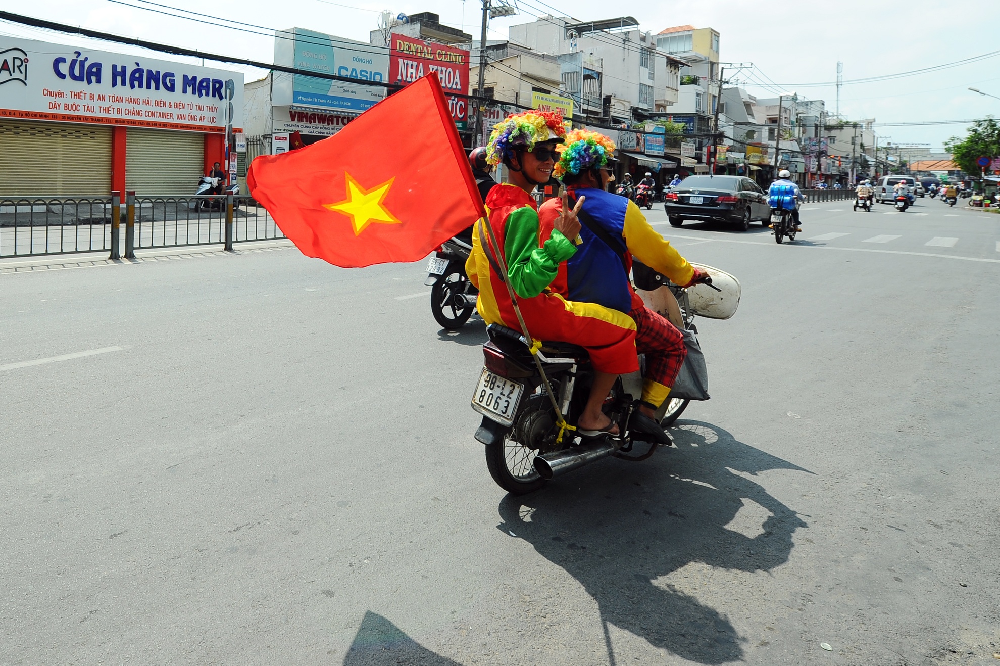 Hai thanh niên tuyên truyền cho gánh xiếc cũng hưởng ứng ngày lễ lớn của đất nước bằng cách treo cờ vào xe.