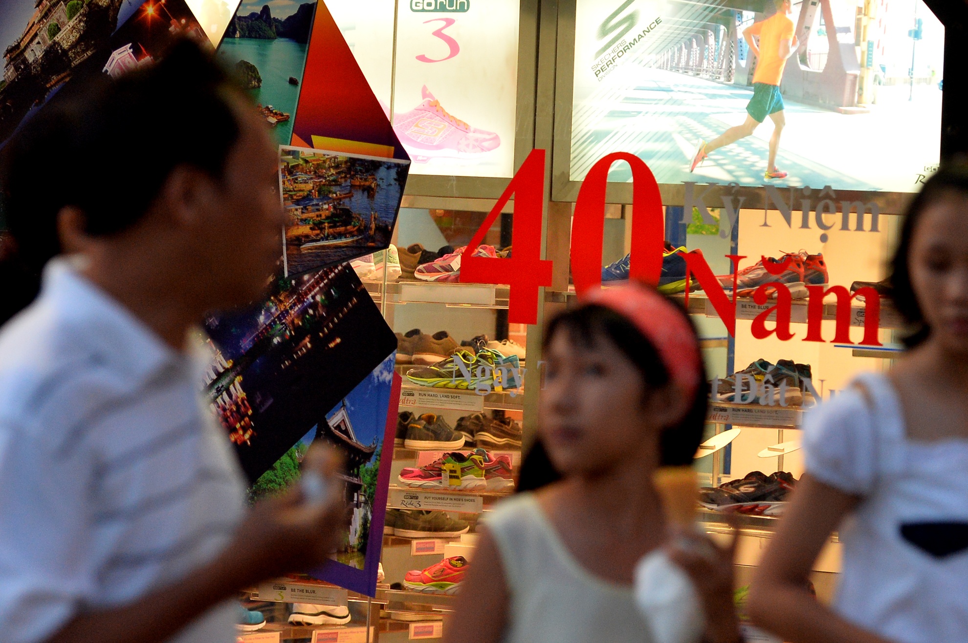 Các cửa hàng kinh doanh cũng trưng biểu ngữ hưởng ứng kỷ niệm 40 năm giải phóng.