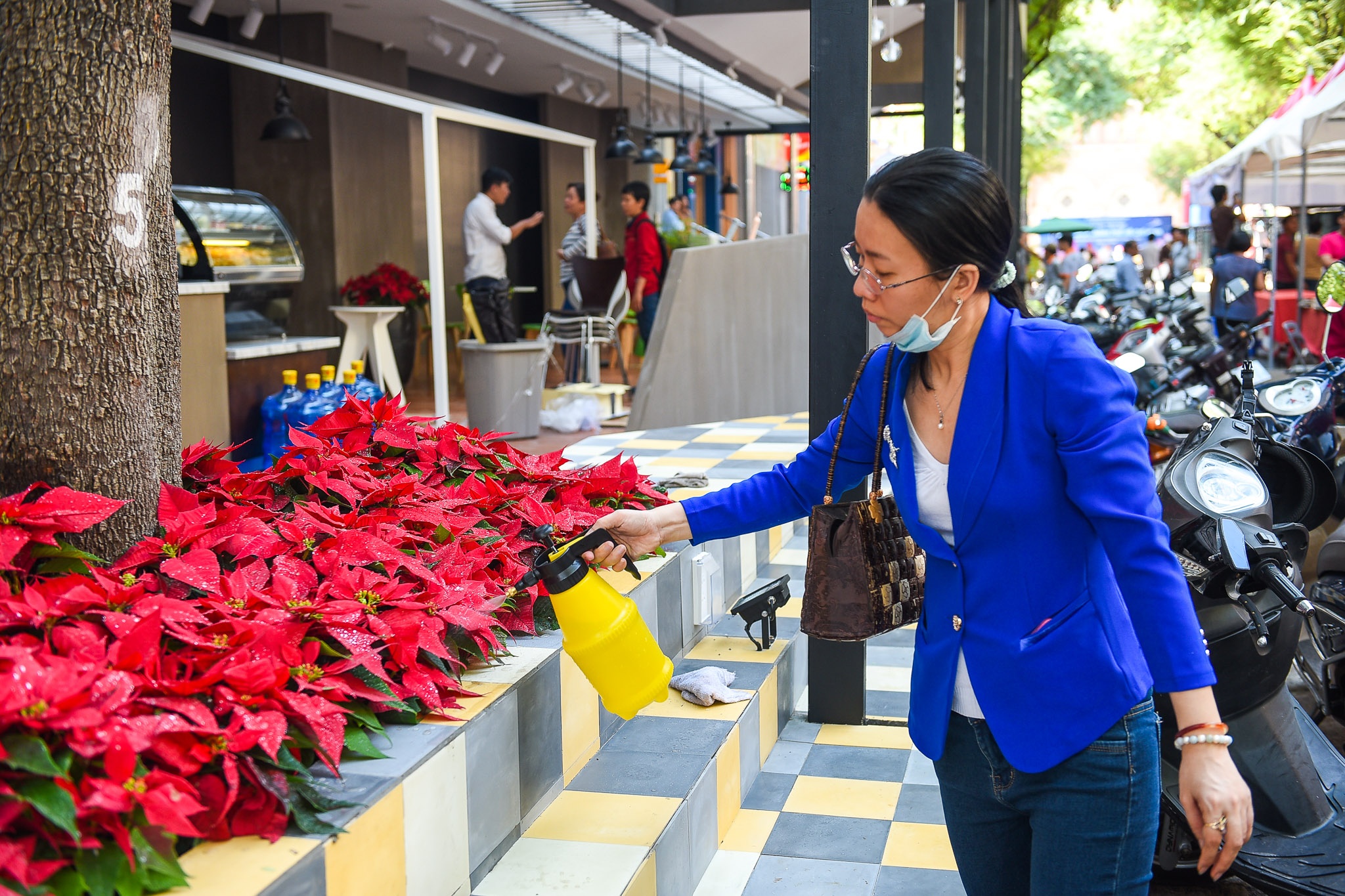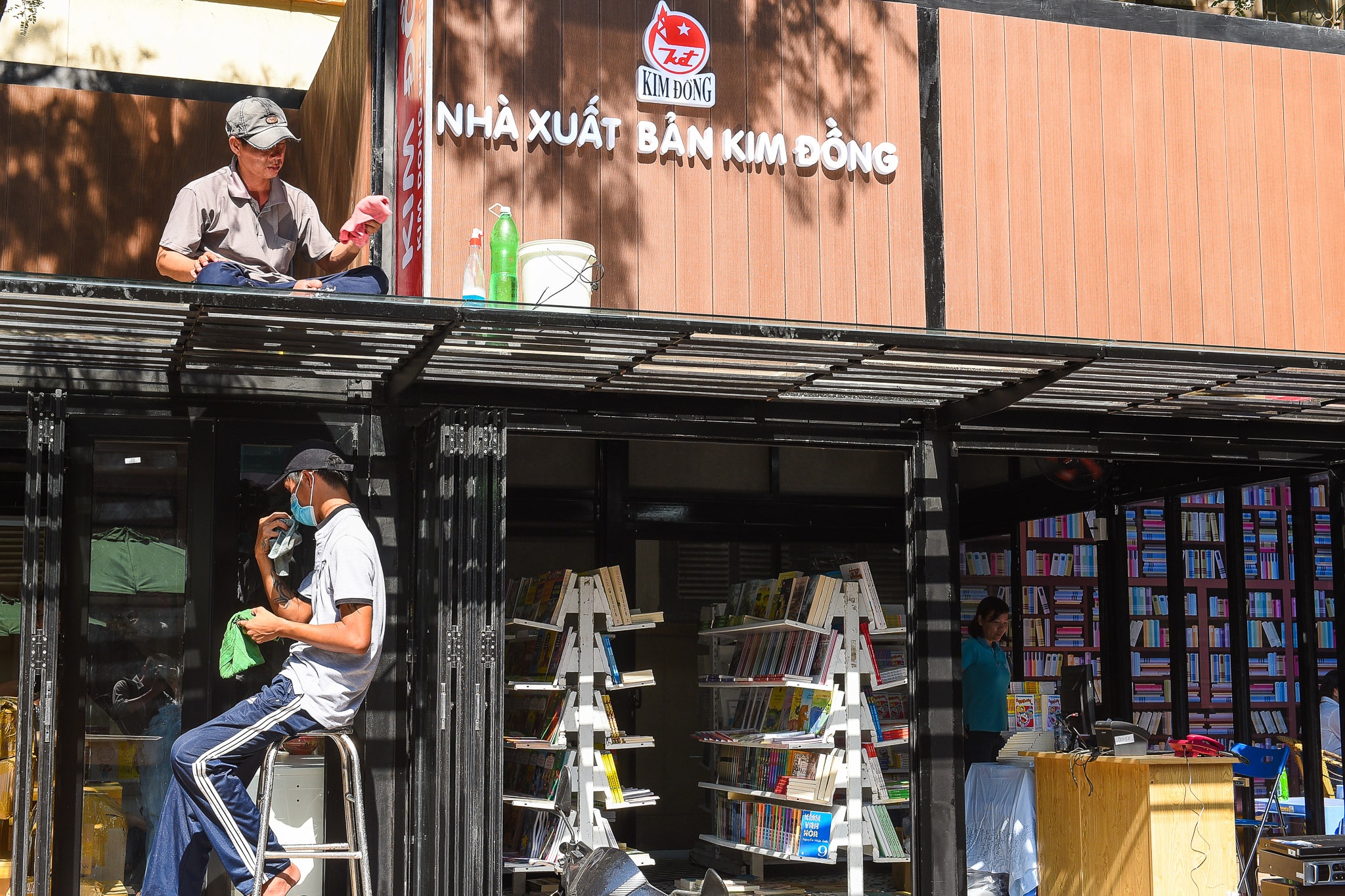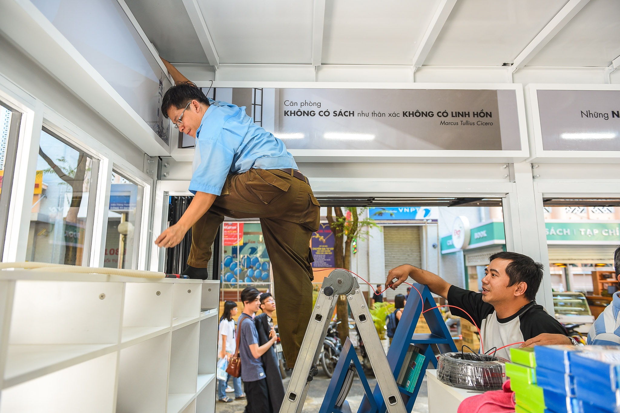 Đế kịp khánh thành đường sách vào chiều 9/1, các đơn vị tham gia phải tất bật trang trí, hoàn thiện gian hàng từ đêm 8/1. Mỗi công ty, nhà xuất bản trang trí gian hàng của mình theo phong cách khác nhau.