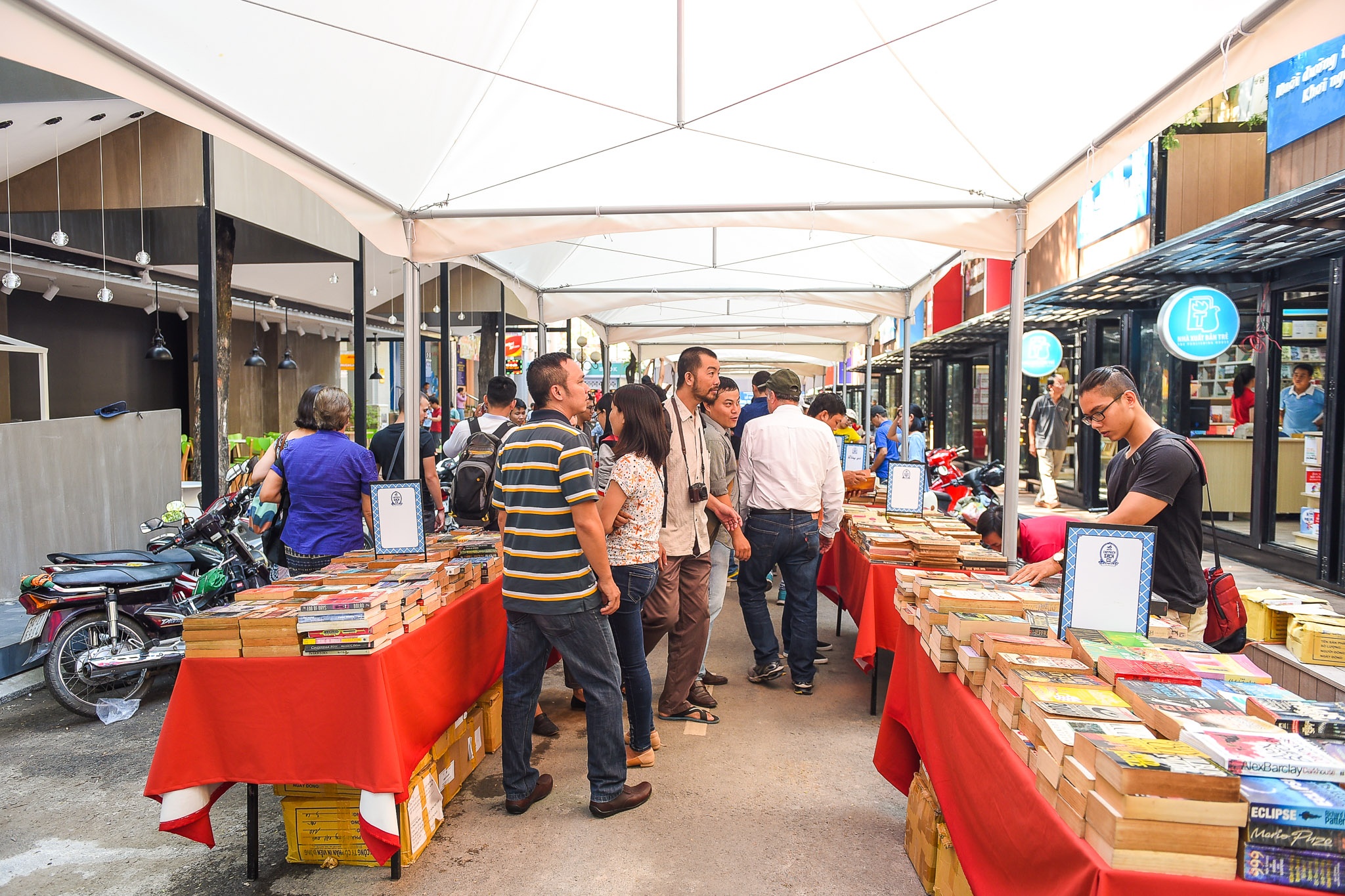 Khu vực bán sách cũ thu hút đông đảo độc giả. Đây là một trong những hoạt động đầu tiên của đường sách TP HCM trong ngày khánh thành.