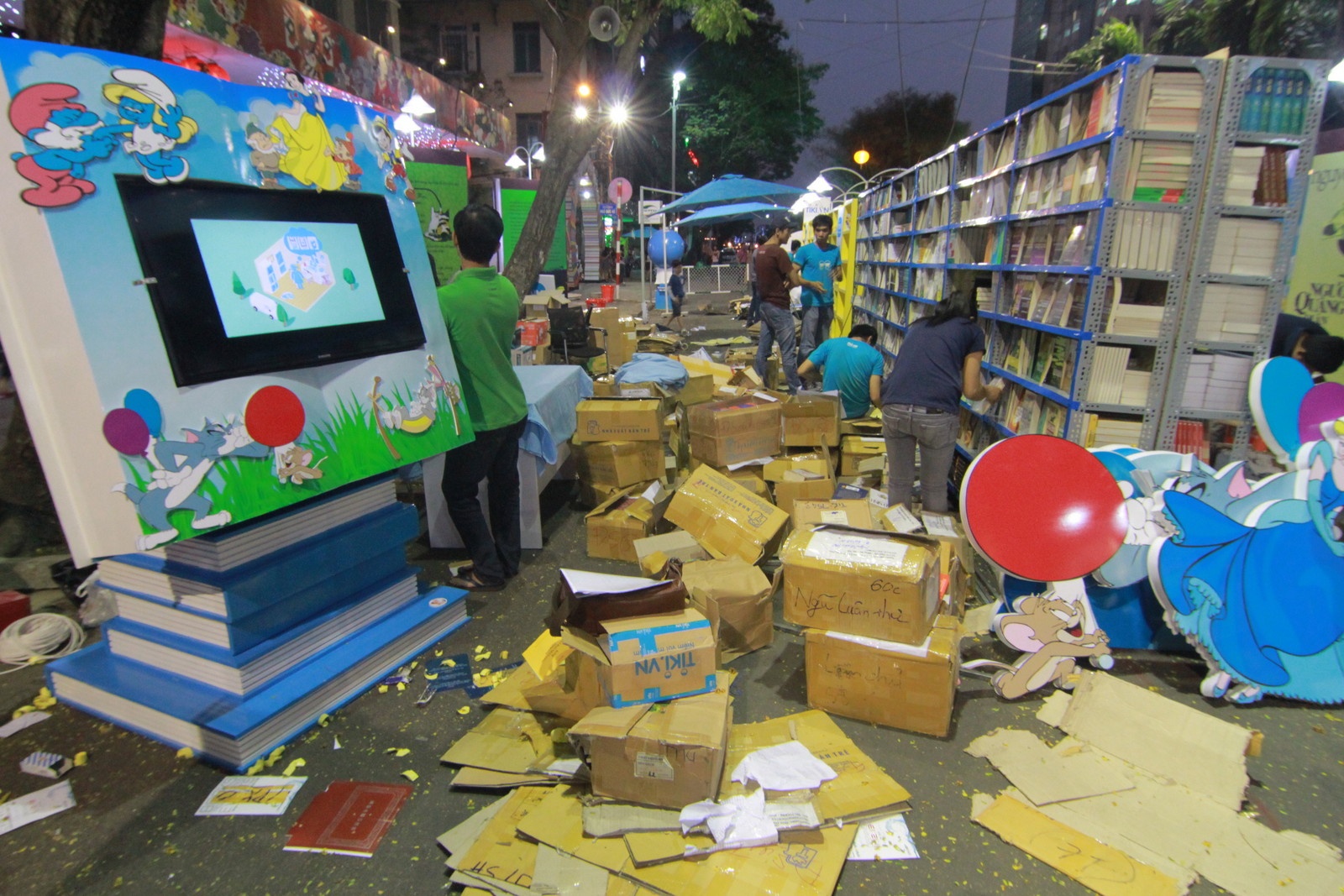 7h tối, các nhân viên đang gấp rút hoàn thành những công việc cuối cùng để kịp thời điểm khai hội đường sách.