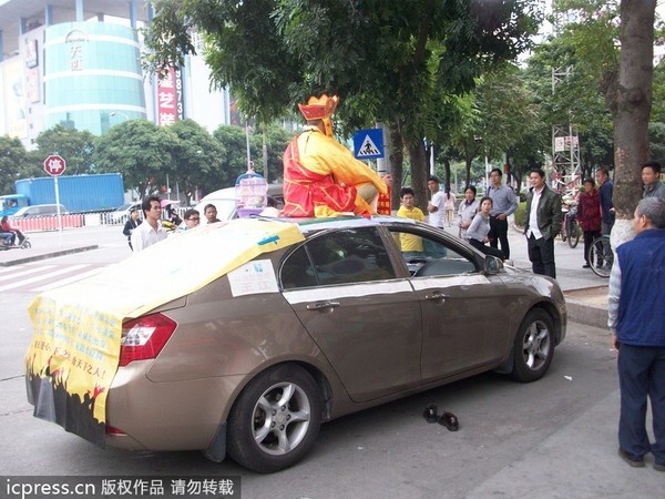 Ngồi trên nóc của một chiếc ô tô con, anh Wang khoác trên mình bộ trang phục nhà sư kèm theo tấm bảng. Hộ tống anh còn có một chú chó nhỏ và một con vẹt đi theo khiến nhiều người liên tưởng tới điển tích thầy trò Đường Tăng trong Tây du ký. Anh Wang cho biết, việc làm kỳ quặc của anh nhằm mục đích kêu gọi quyên góp từ thiện 100 triệu nhân dân tệ (khoảng 34 tỷ đồng).
