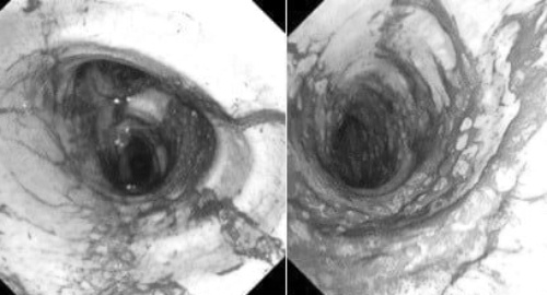 Đường thở của cả hai người bệnh bám nhiều bụi đen từ khói và tổn thương viêm sung huyết toàn bộ đường thở. Ảnh: BVCC. |