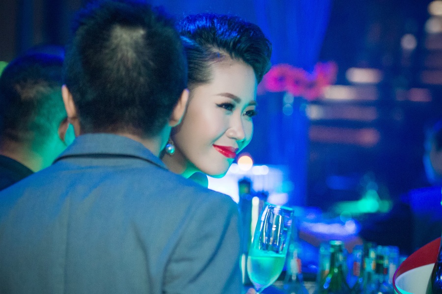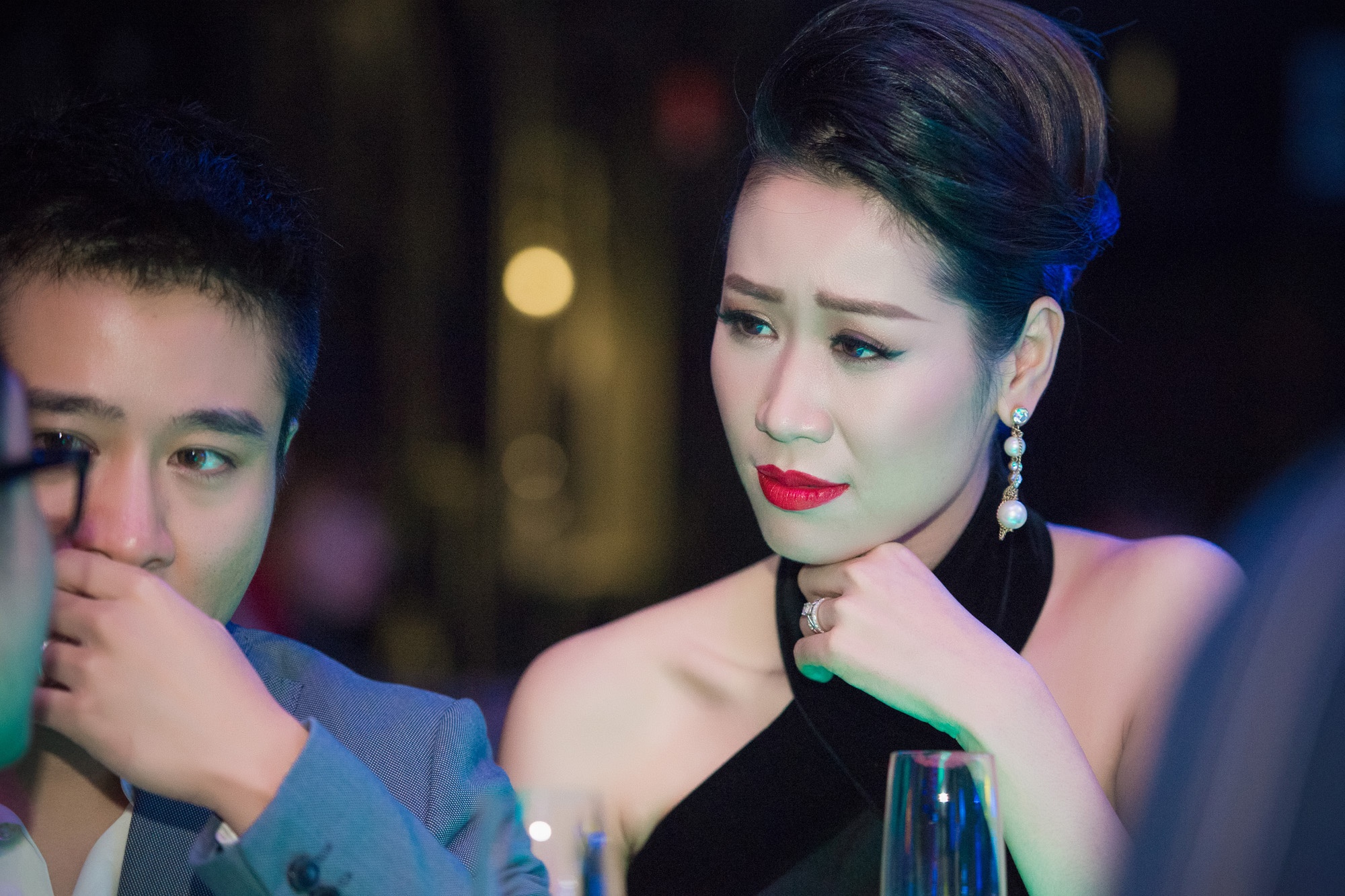 | Trong suốt buổi tiệc, Dương Mỹ Linh luôn ở cạnh chồng, trò chuyện thân thiết cùng anh. |