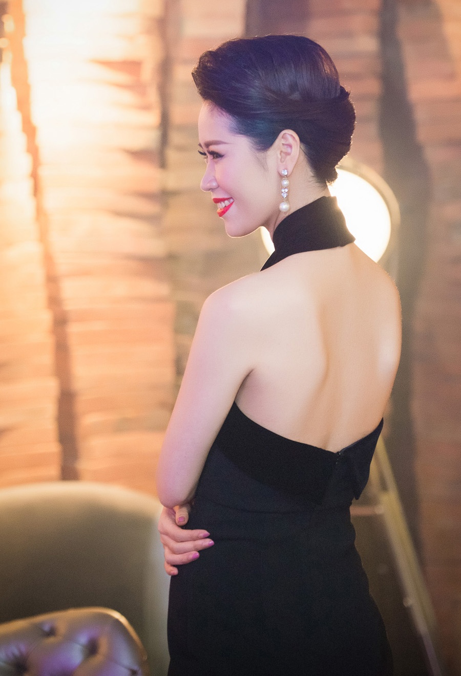 | Dương Thùy Linh diện bộ váy tông đen khoe vai trần quyến rũ, tông trang điểm đậm cùng kiểu tóc búi thanh lịch. |