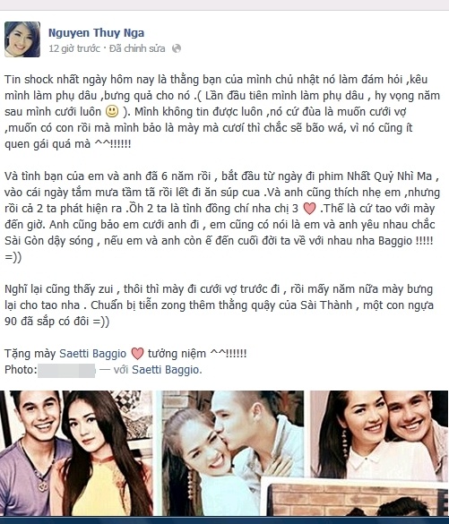 Chính Thúy Nga cũng là người đầu tiên xác nhận thông tin về chuyện hôn nhân của Baggio trên trang cá nhân. Cô chia sẻ rất shock khi nhận được tin và lời đề nghị làm phụ dâu từ bạn thân. Diễn viên 9X cũng bật mí từng có thời gian hai người "cảm nắng" nhưng nhanh chóng phát hiện "ồ, 2 ta là tình đồng chí" và từ đó, họ trở thành bạn thân.