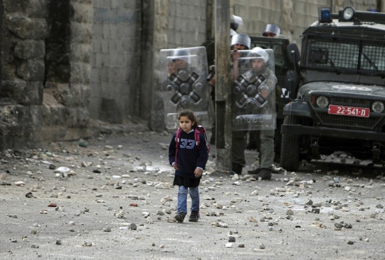 | Nhiếp ảnh gia Ammar Awad của Reuters đã chụp lại bức ảnh độc đáo trong cuộc chiến giữa binh sĩ Israel và chiến binh Palestine. Một bé gái đeo cặp điềm tĩnh bước tới trường khi xung quanh bạo lực vẫn tiếp diễn trong các trại tị nạn gần thành phố Jerusalem. Em bước qua những viên đá và mảnh vụn mà người biểu tình ném về phía cảnh sát. Ảnh: Ammar Awad |