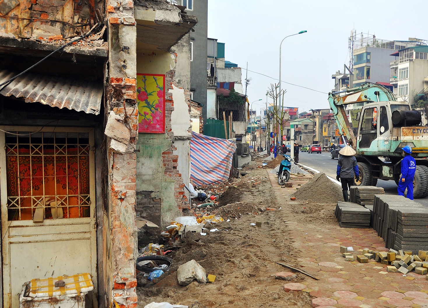 | Với những gia đình còn một phần đất vẫn có thể sinh sống sẽ được tư vấn sửa chữa để đảm bảo mỹ quan đô thị tuyến phố văn minh. Trong ảnh: Một căn hộ hình chữ P lộ ra sau ngày thông xe. |