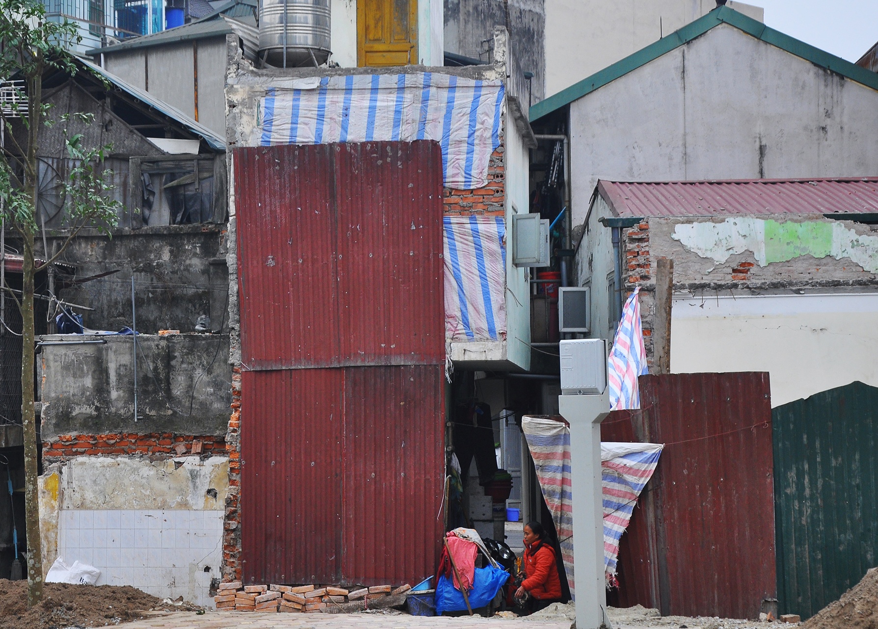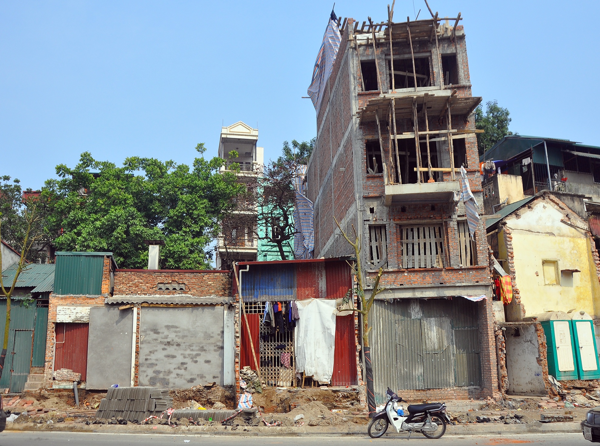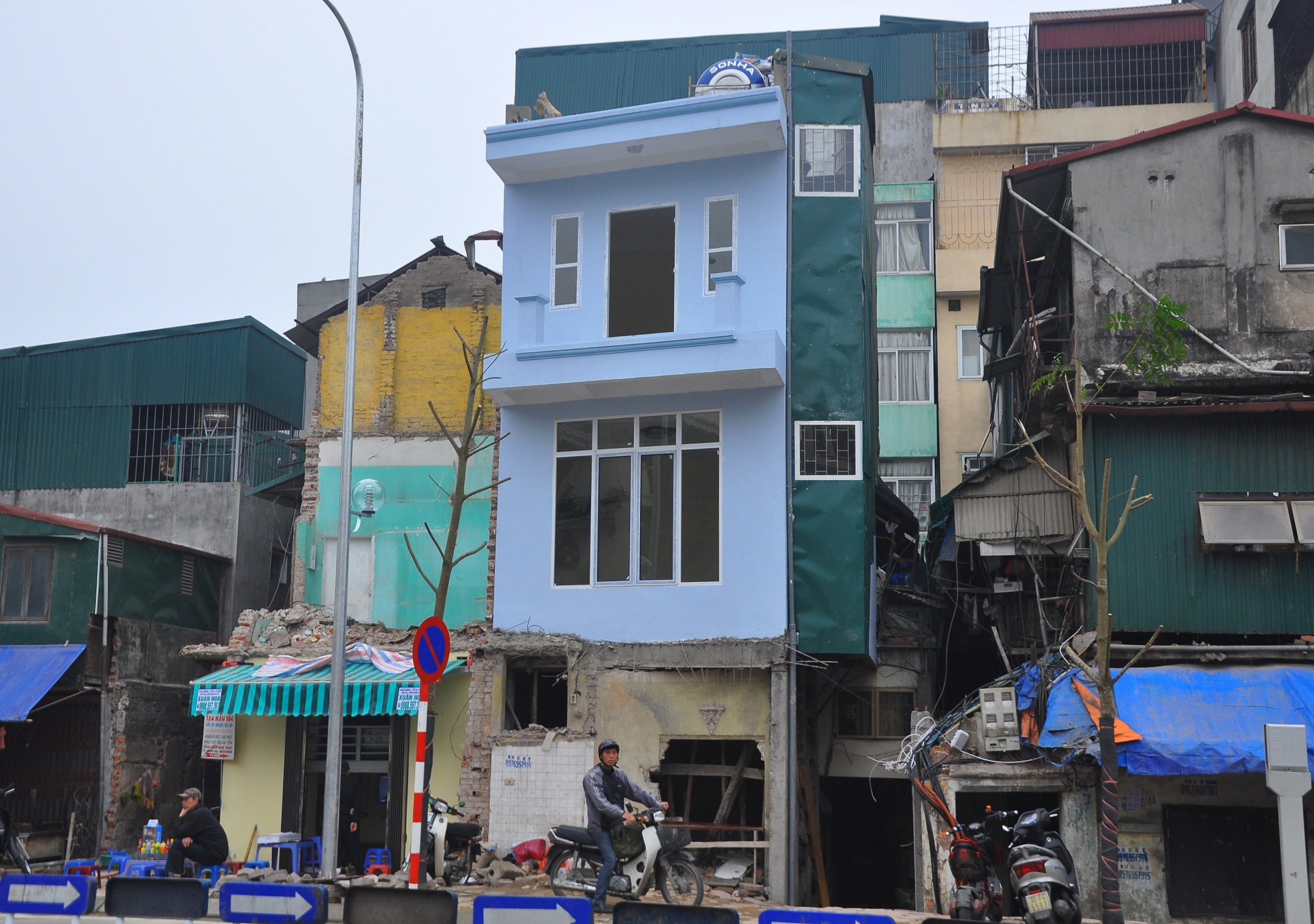 Trước ngày thông xe, lãnh đạo thành ủy Hà Nội đã có chỉ đạo chính quyền quận Ba Đình lưu ý không được để xảy ra tình trạng nhà siêu mỏng, siêu méo khi hoàn đường và cần tổ chức chỉnh trang tuyến phố văn minh, sạch đẹp đảm bảo mỹ quan đô thị. Trong ảnh: Một ngôi nhà đang xây dựng nhưng có hiện tượng bị nghiêng so với những căn hộ xung quanh.