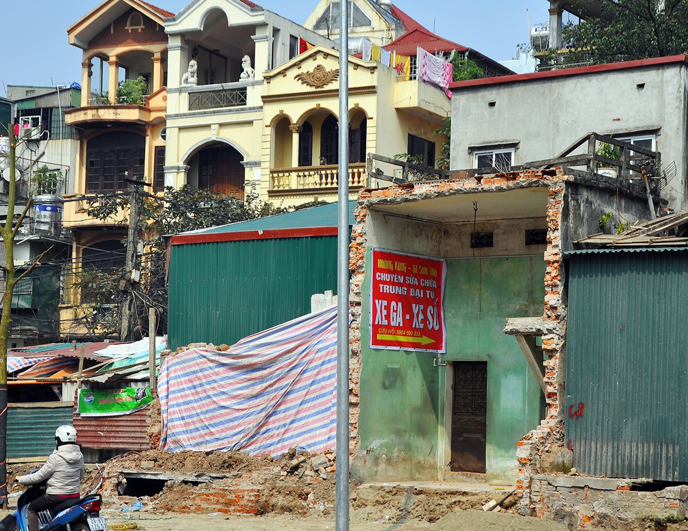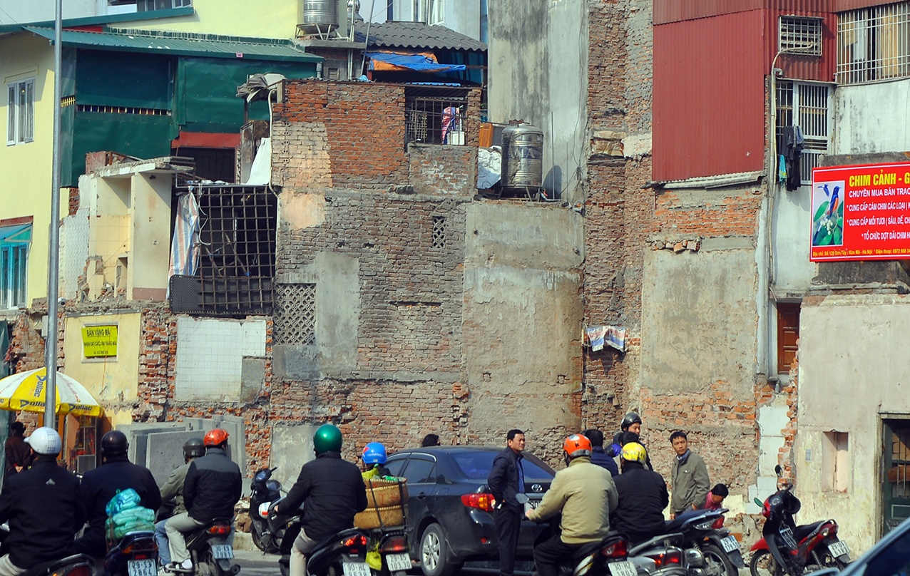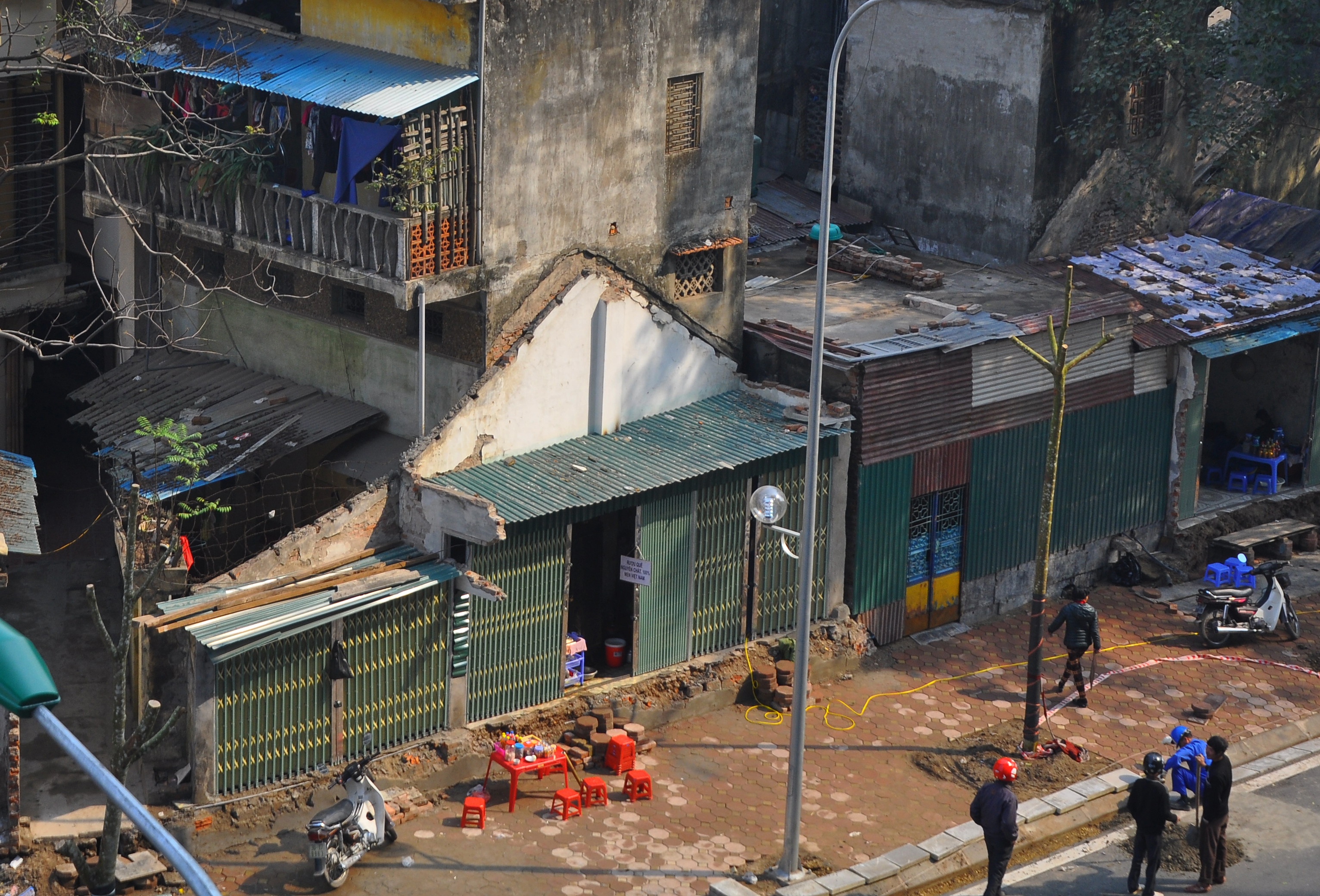 Trước ngày thông xe, lãnh đạo thành ủy Hà Nội đã có chỉ đạo chính quyền quận Ba Đình lưu ý không được để xảy ra tình trạng nhà siêu mỏng, siêu méo khi hoàn đường và cần tổ chức chỉnh trang tuyến phố văn minh, sạch đẹp đảm bảo mỹ quan đô thị. Trong ảnh: Một ngôi nhà đang xây dựng nhưng có hiện tượng bị nghiêng so với những căn hộ xung quanh.