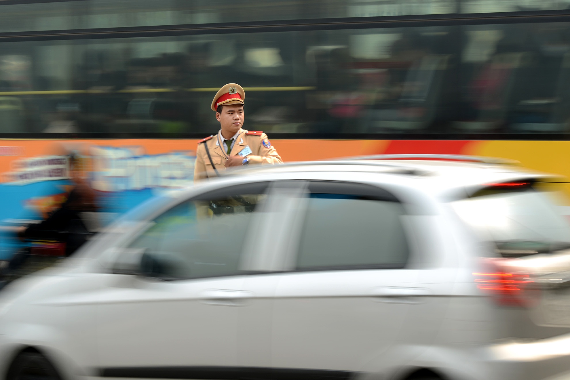 | Thiếu uý Lê Anh Vũ thuộc đội CSGT số 6 vất vả điều tiết dòng xe cộ qua lại tại ngã tư dưới gầm cầu vượt mai Dịch. |