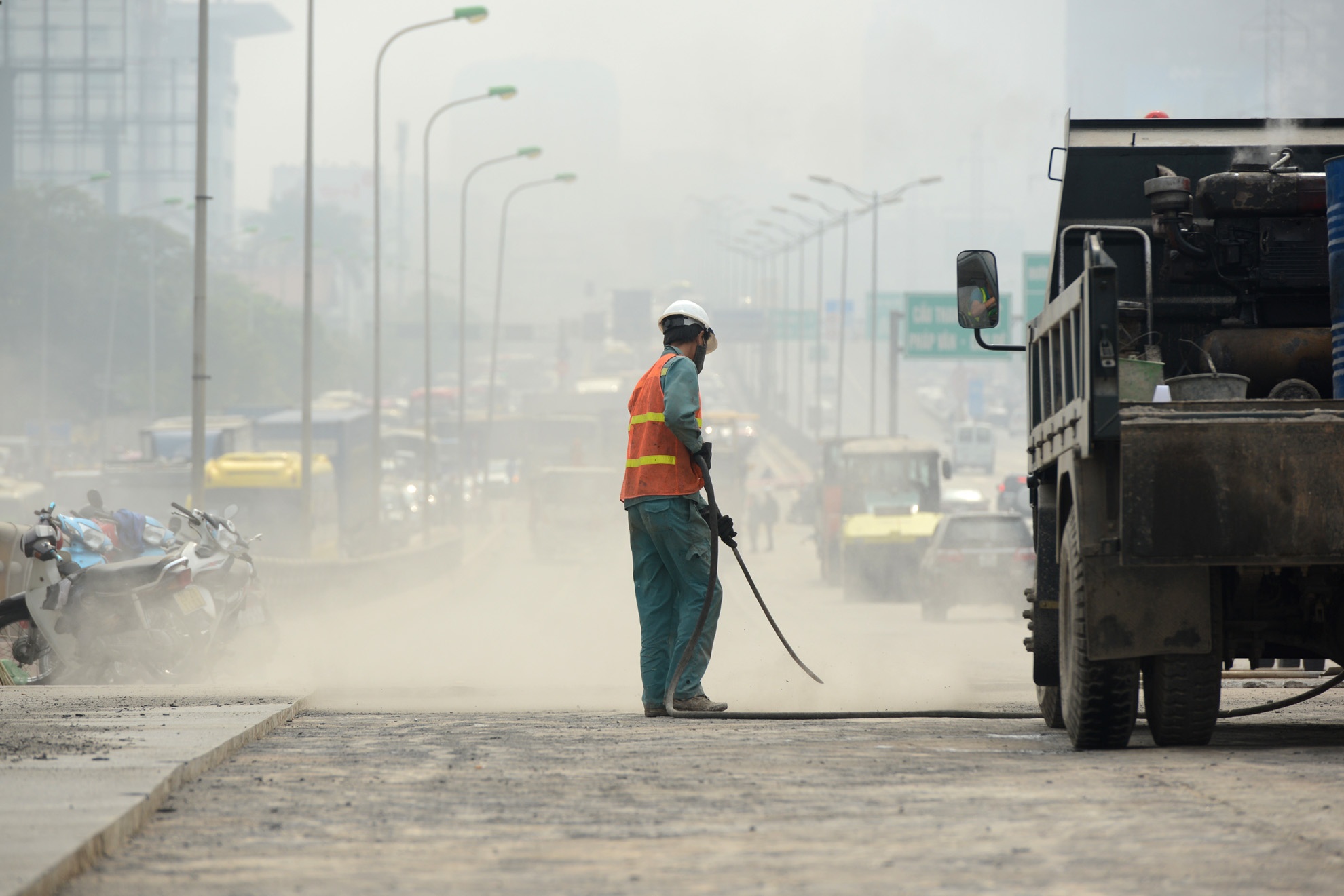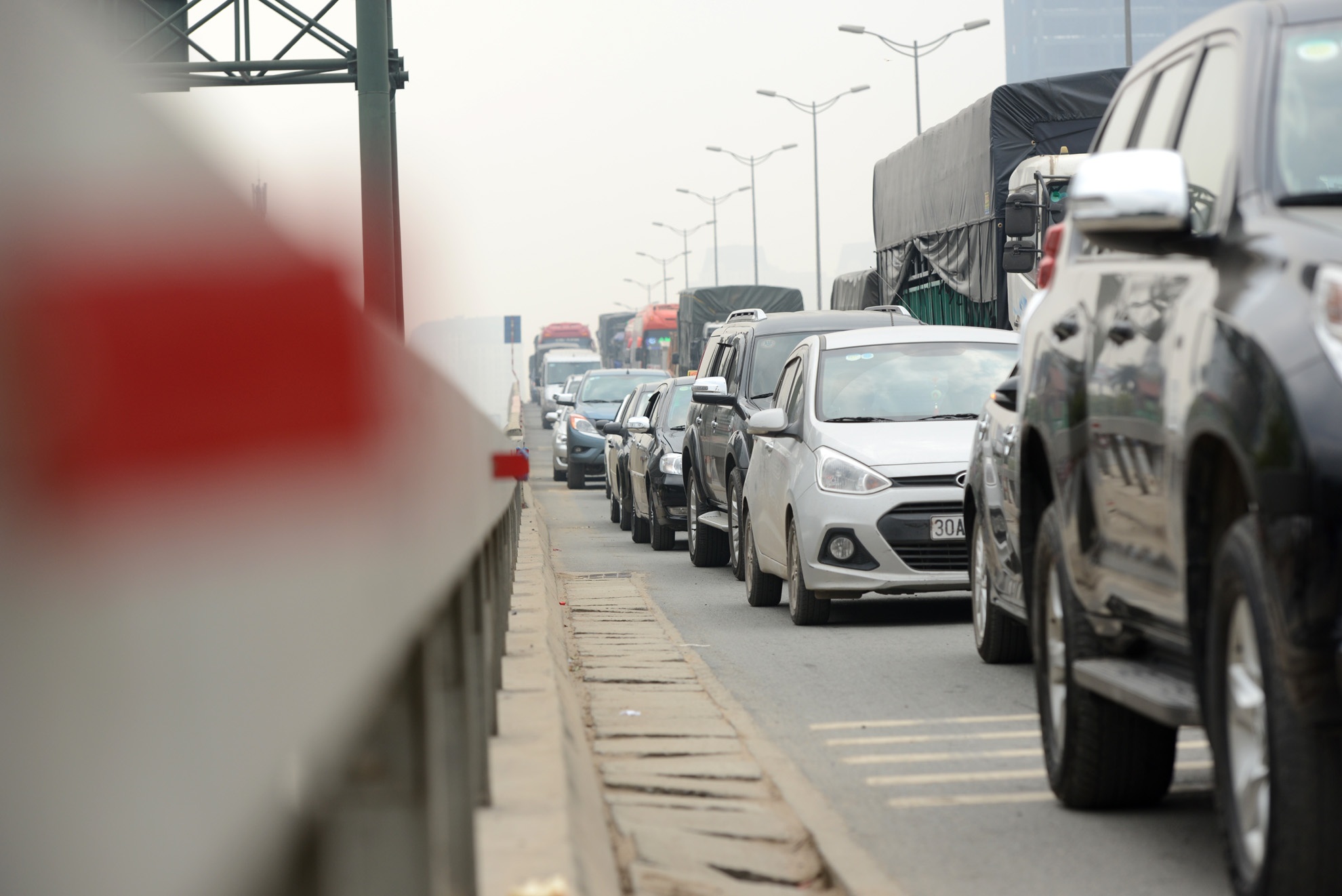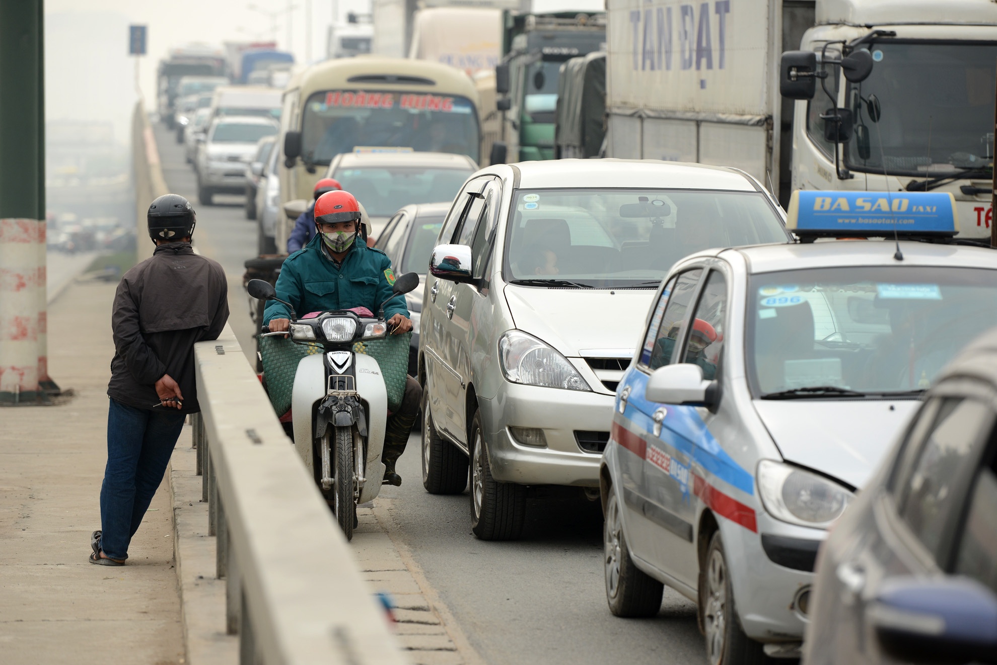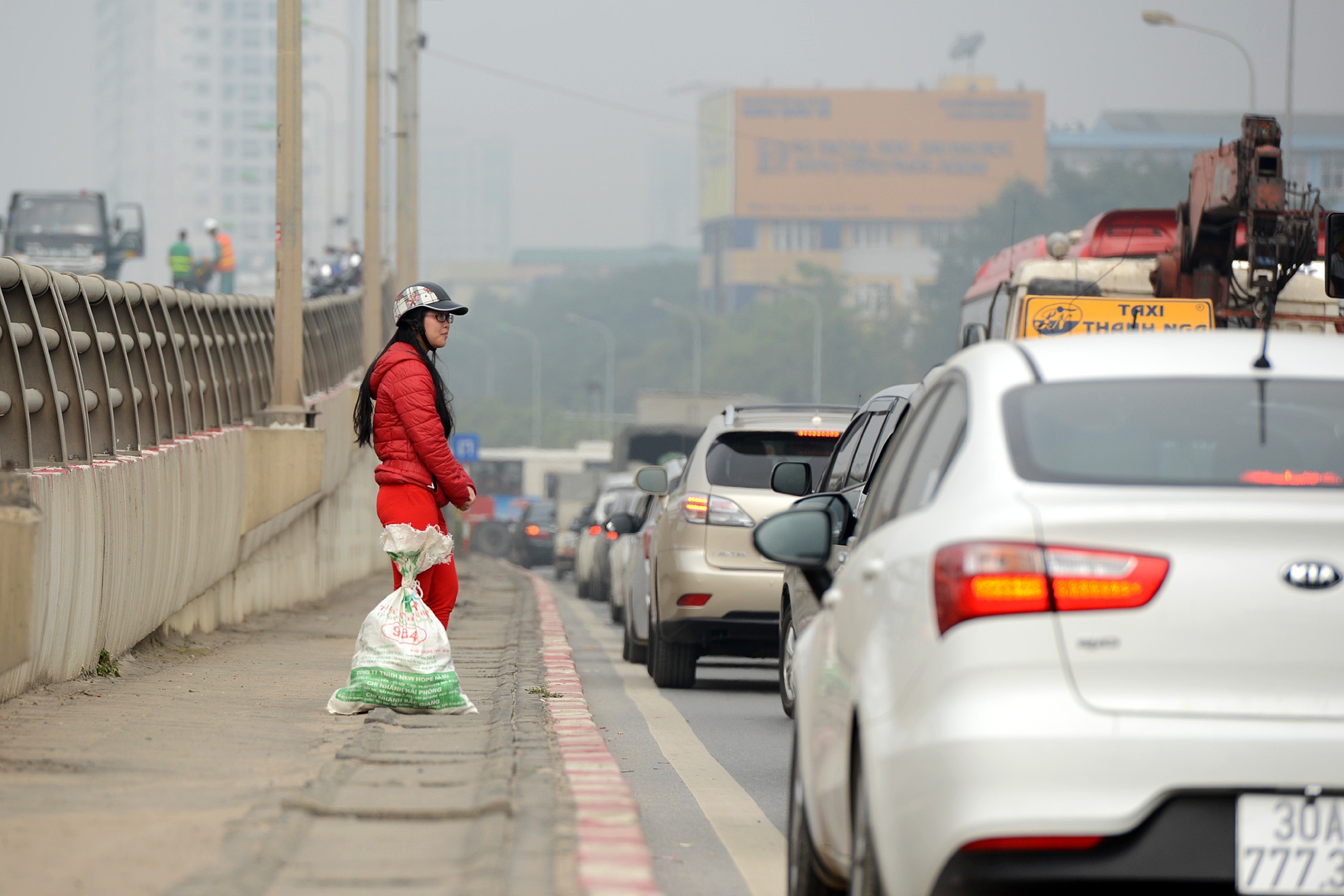 | Hành khách xuống xe ở chân cầu đứng chờ dòng xe chạy qua để sang đường. |