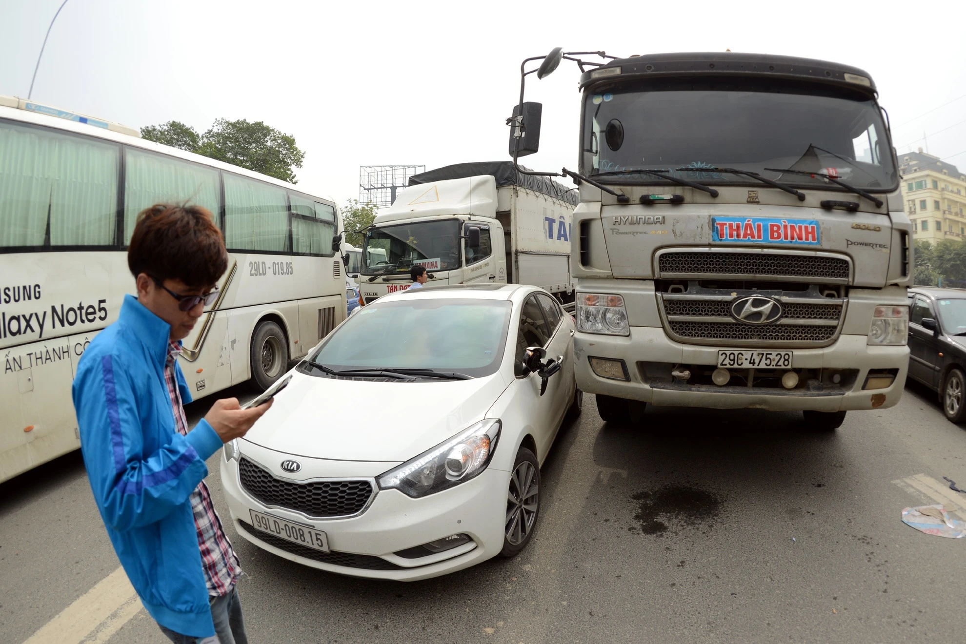 | Đã có va chạm xảy ra khi 1 xe tải chở vật liệu xây dựng chèn ép vào xe 4 chỗ do 1 người Hàn Quốc điều khiển. |