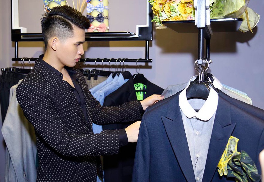 | Thần tượng âm nhạc 2008 Quốc Thiên cũng say mê lựa chọn trang phục, ủng hộ shop ngày khai trương. |