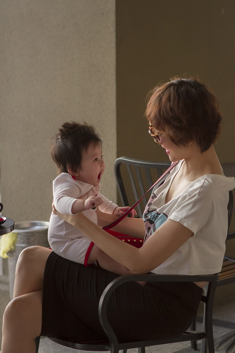 Bà mẹ hai con diện trang phục năng động, khỏe khoắn. Bé Gà mặc áo đồng tông màu trắng với mẹ. Cậu nhóc khá cứng cáp, tinh nghịch và rất thích cười.