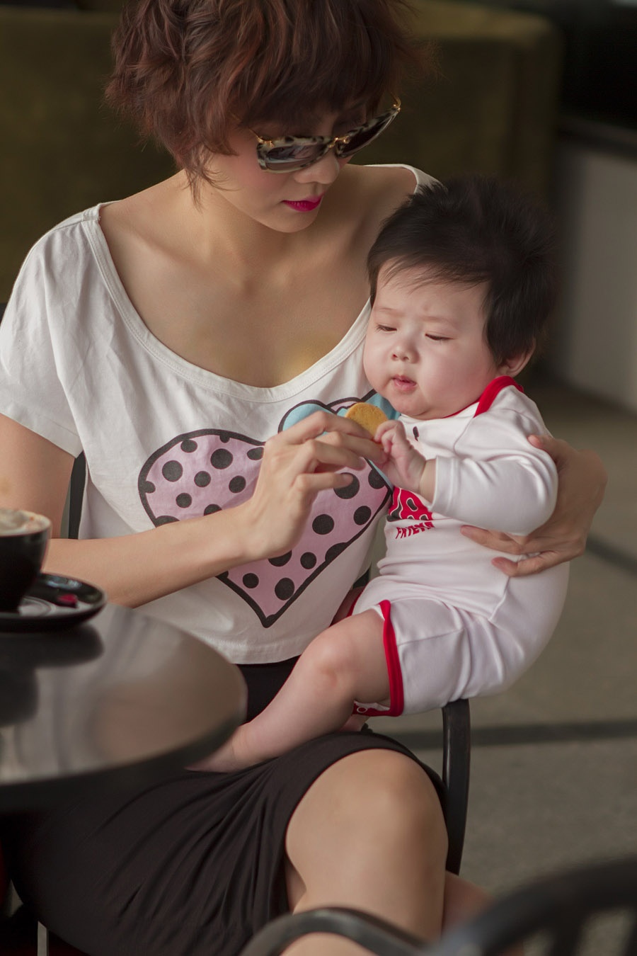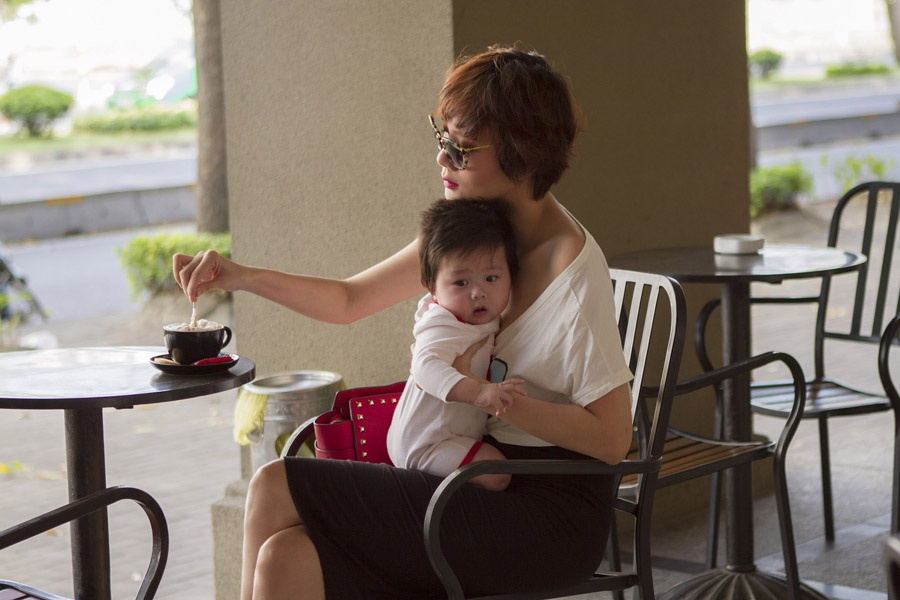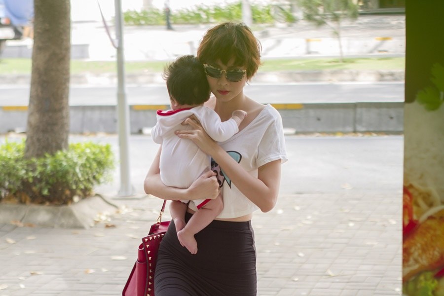 Dương Yến Ngọc mặc crop-top đưa con trai 5 tháng tuổi ra phố