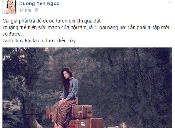 Trên trang cá nhân, người đẹp sinh năm 1979 đăng tải tâm sự khiến nghi vấn được đẩy lên cao. Cô viết: "Cái giá phải trả để được tự do đôi khi quá đắt. Im lặng thể hiện sức mạnh của nội tâm, là một loại năng lực cần phải tu tập mới có được. Lành thay khi ta có được điều này".