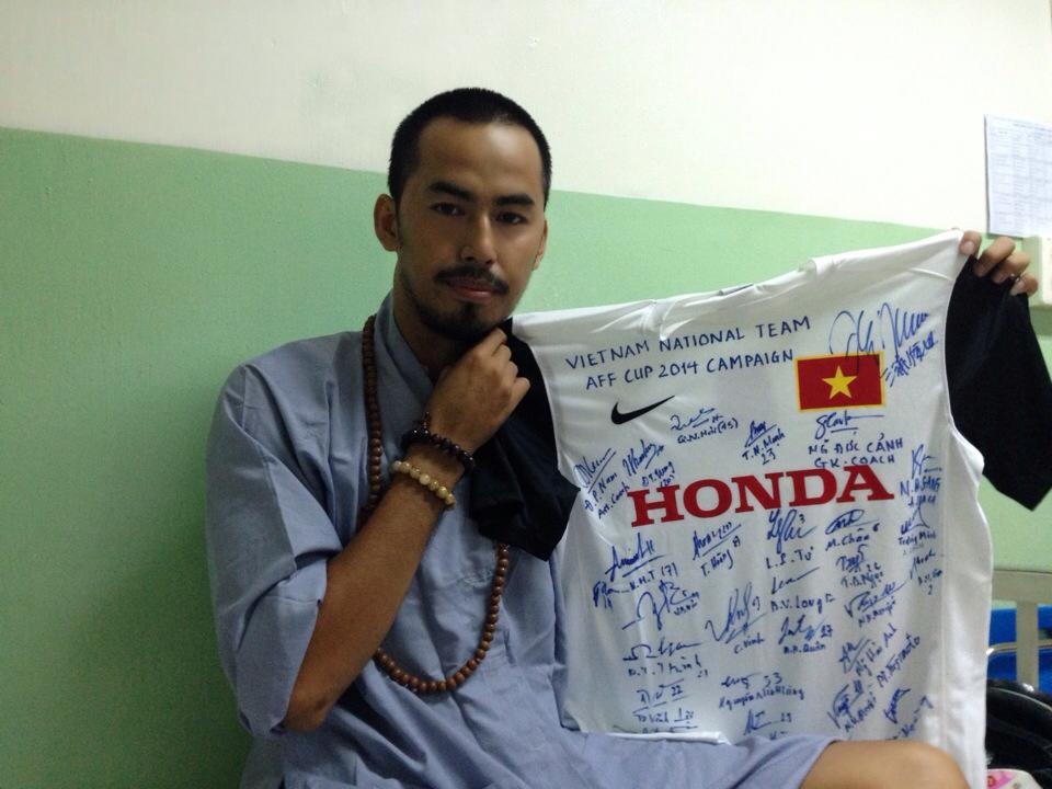 Trước khi vào giai đoạn quan trọng nhất để "tuyên chiến" với bệnh ung thư bạch cầu cấp, nam diễn viên Duy Nhân đã mặc chiếc áo đấu của ĐTVN với chữ ký của các thành viên trong đội.