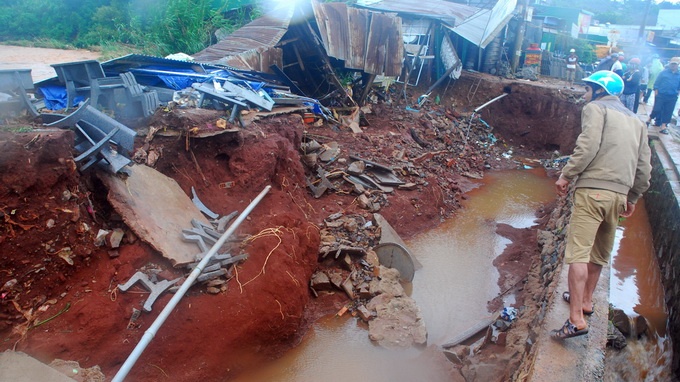 | Nhà dân ở giáp cầu trung tâm thị trấn Ea Đrăng bị nước lũ cuốn trôi. |