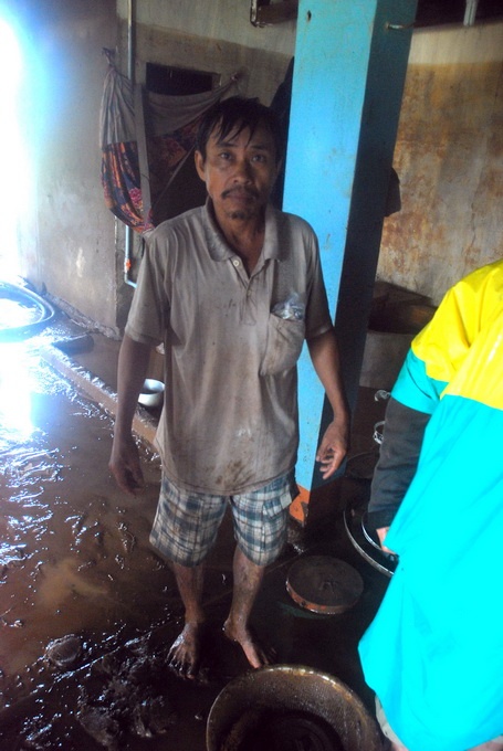 | Một người dân ướt sũng, đứng co ro trong mưa lạnh để rửa bùn trong nhà. |