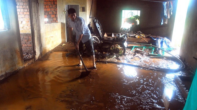 | Một gia đình thu dọn đồ đạc, rửa sạch nhà sau khi lũ bất ngờ tràn vào. |