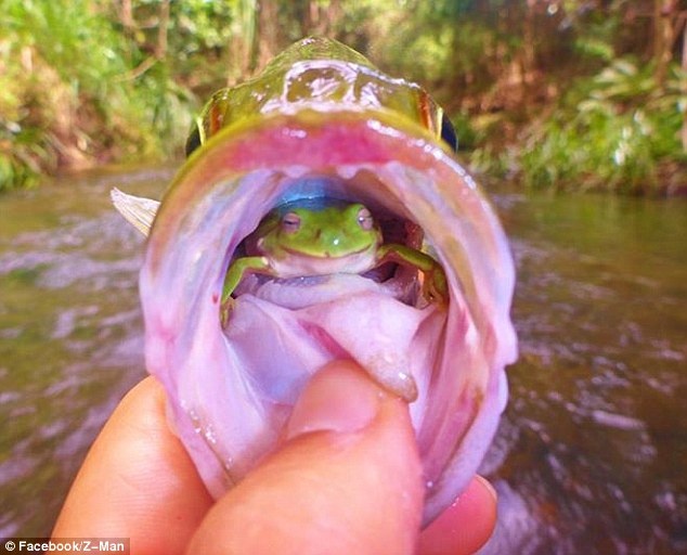 Anh Angus James tới hồ nước ở phía bắc thành phố Townsville, Úc, để câu cá vào cuối tuần. Tại đây, một chú cá rô rừng màu sáng đã dính câu. Đáng ngạc nhiên hơn, khi James gỡ mồi câu, anh phát hiện một chú ếch cốm bên trong miệng cá.