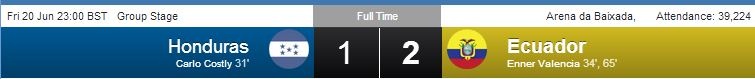 HẾT GIỜ! Đúng lúc này trọng tài chính Jon Williams cũng nổi hồi còi kết thúc trận đấu giữa Ecuador và Honduras. Chiến thắng 2-1 dành cho đại diện Nam Mỹ.