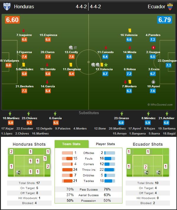 Do không sở hữu quá nhiều chất sáng tạo nơi tuyến giữa nên cả hai đều trung thành với phong cách thi đấu quen thuộc. Trong khi Ecuador chủ yếu tận dụng khả năng xuyên phá từ hai cánh của bộ đôi Antonio Valencia và Montero thì Honduras lại sử dụng khá nhiều đường phất bóng dài lên phía trên cho cặp tiền đạo Bengtson và Carlo Costly.