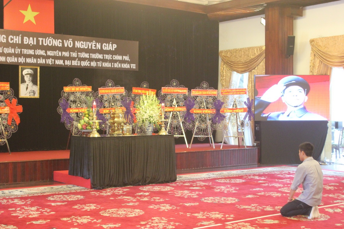 | Bạn Trần Văn Vũ (quê Đồng Tháp, trú Q.9), quỳ trước bàn thờ Đại tướng trong hội trường Thống Nhất gần 1 giờ khiến nhiều người xúc động. Vũ cho biết: "Vì bận quá nên trưa nay mới tới viếng Đại tướng được. Em luôn có cảm giác như Bác Giáp - là thần tượng của em - vẫn đang còn sống" |