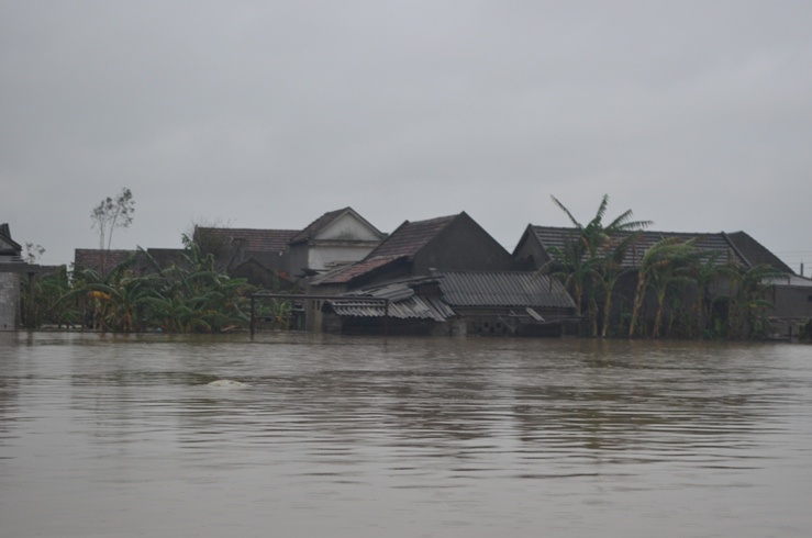 | Nước lũ tại các sông ở Quảng Bình tiếp tục lên nhanh. Nhiều ngôi nhà đã bị ngập tới nóc. |