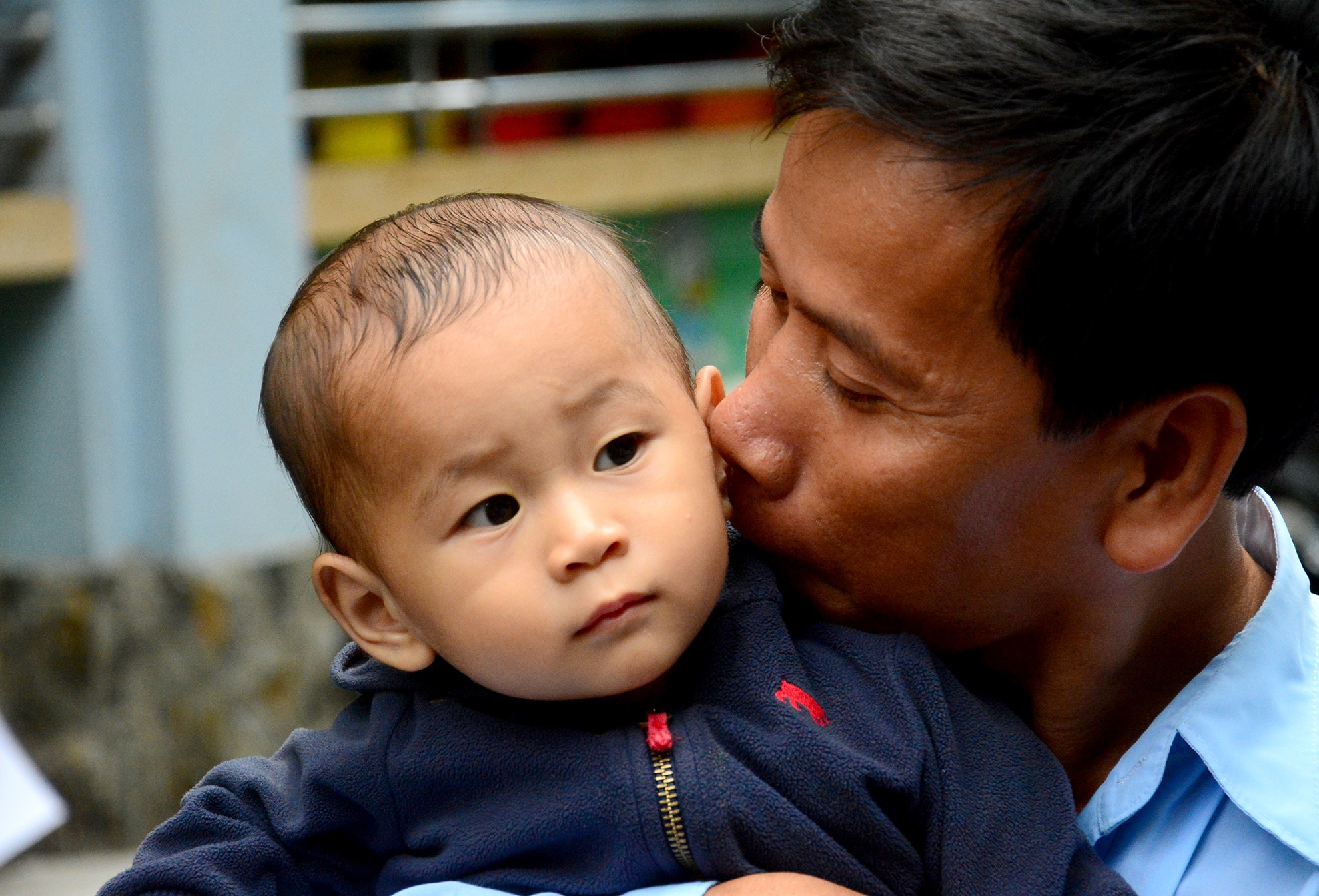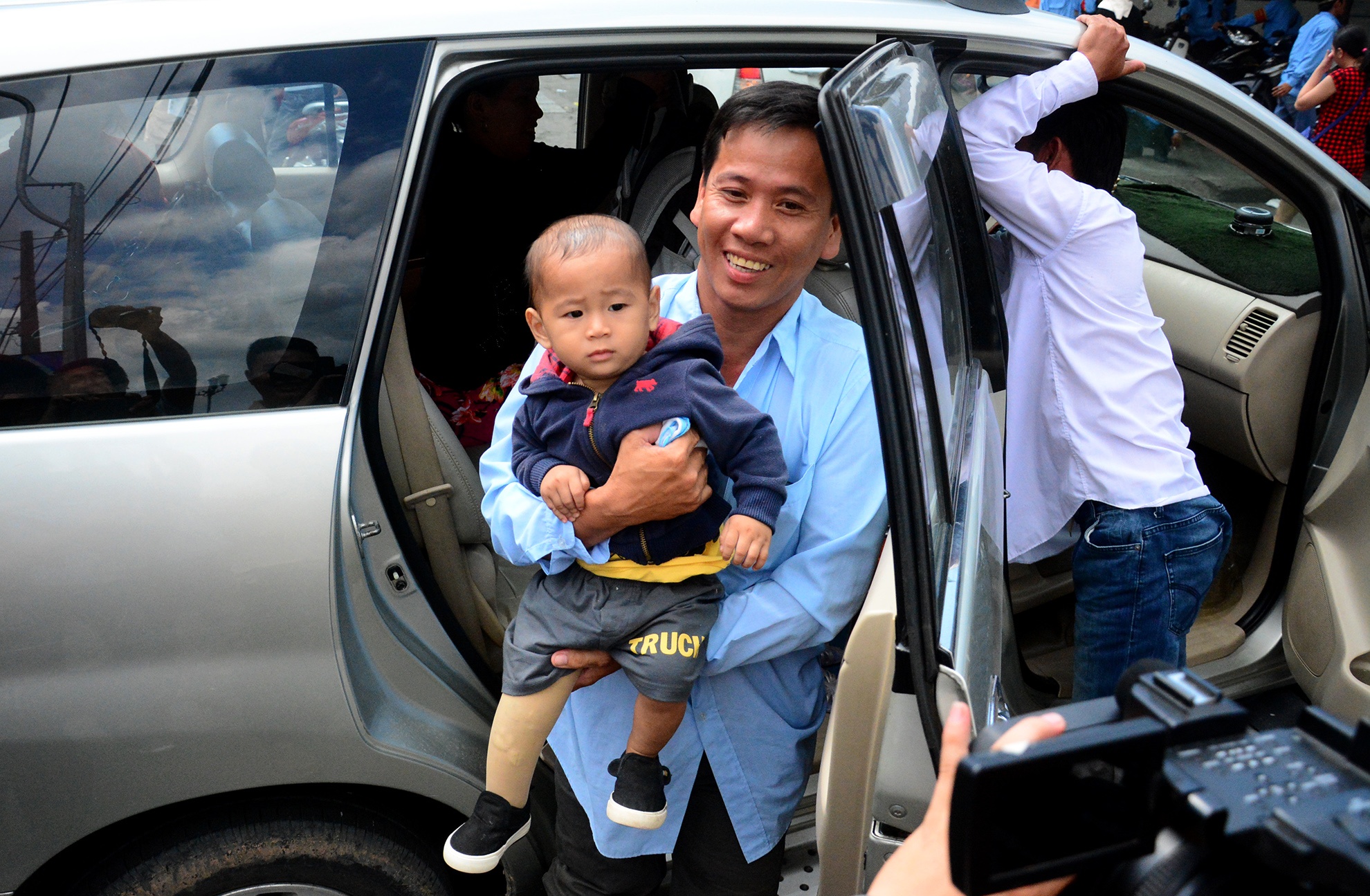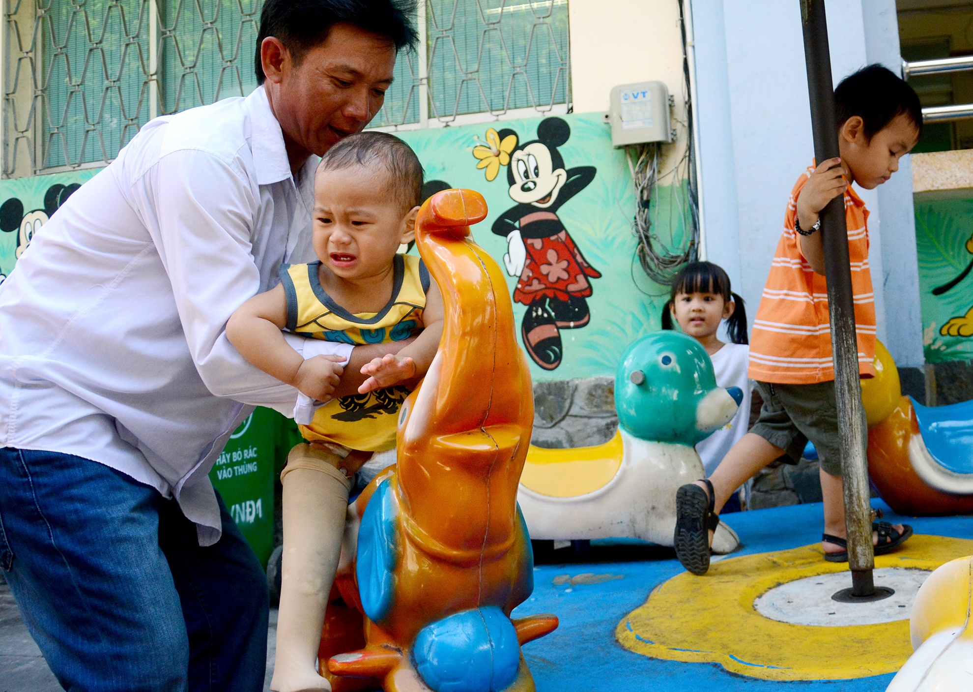 Không chỉ chân phải của bé vừa được lắp, chân phải của anh Nam cũng là chân giả sau vụ tai nạn. Tuy nhiên, anh chỉ bị khó khăn thời gian đầu, nay đã có thể đi lại bình thường, bồng bế và chăm sóc hai con.