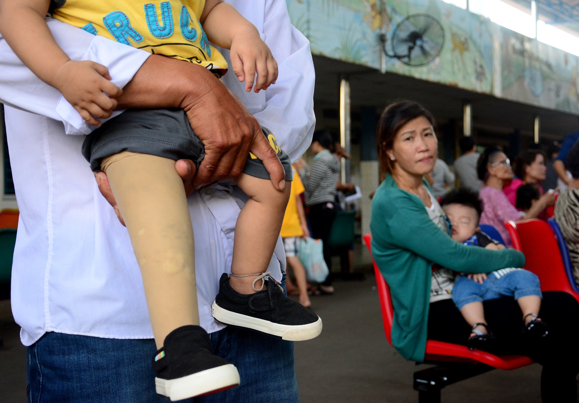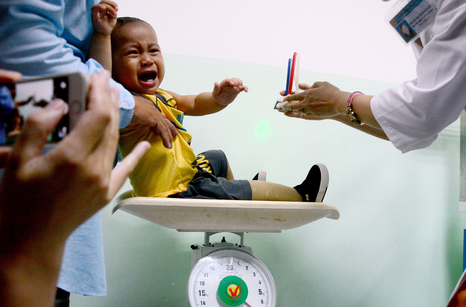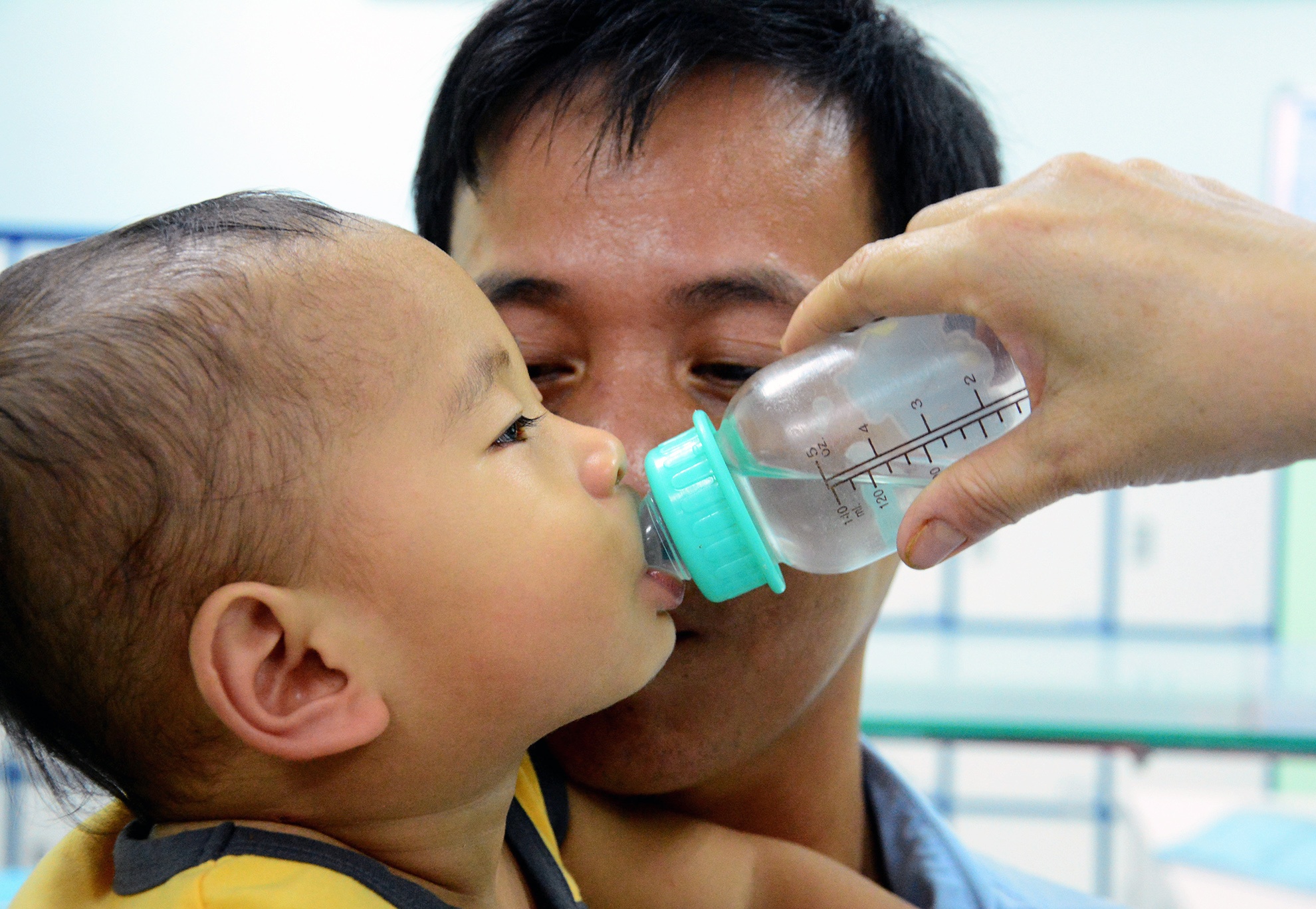 Trời khá nóng và đông người, Huy khóc và uống nhiều nước trong quá trình tái khám.