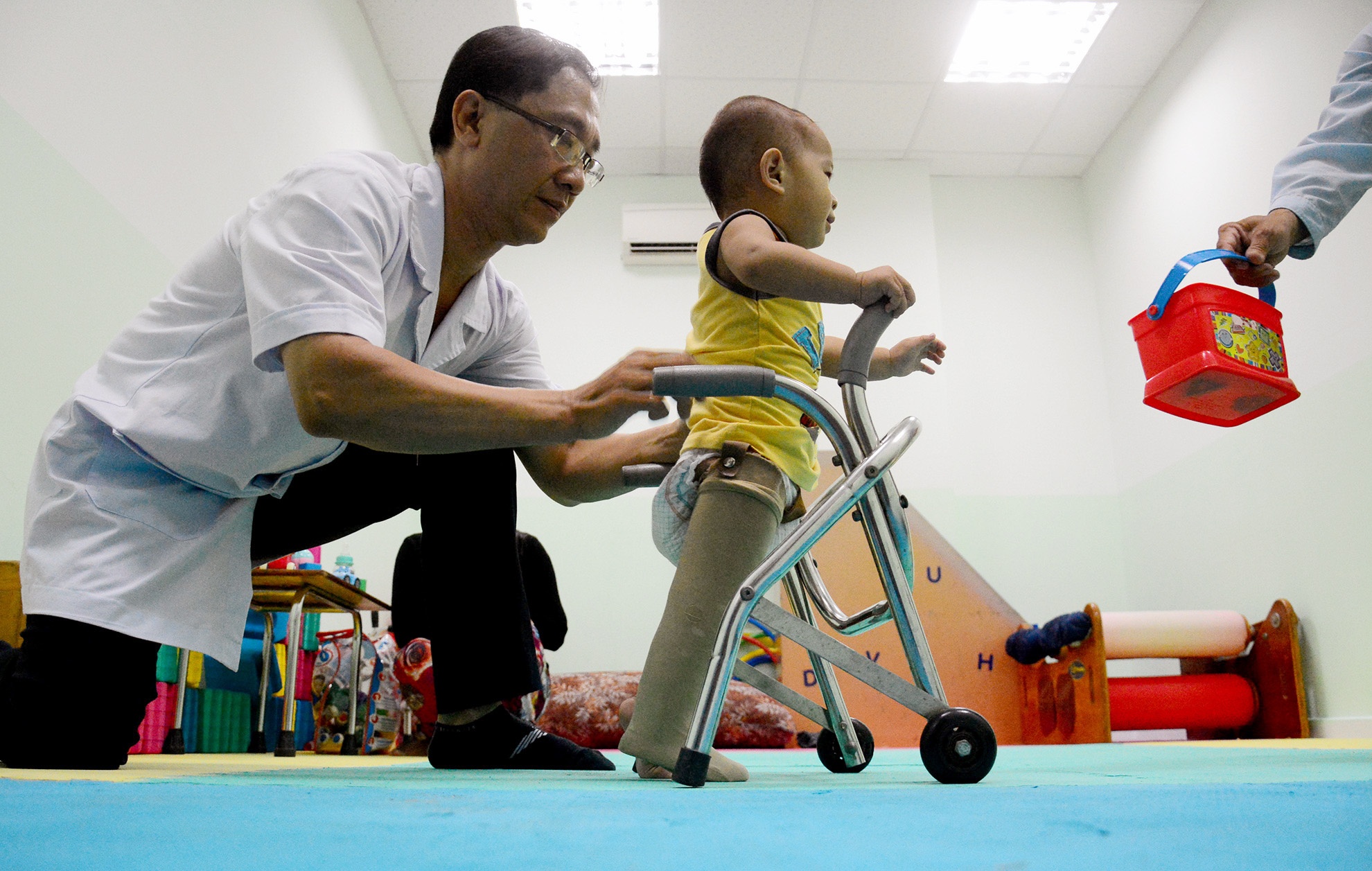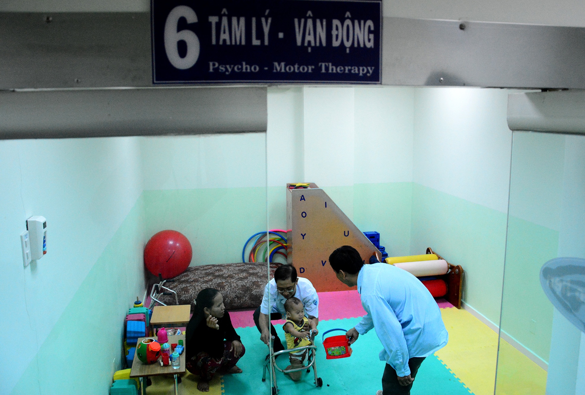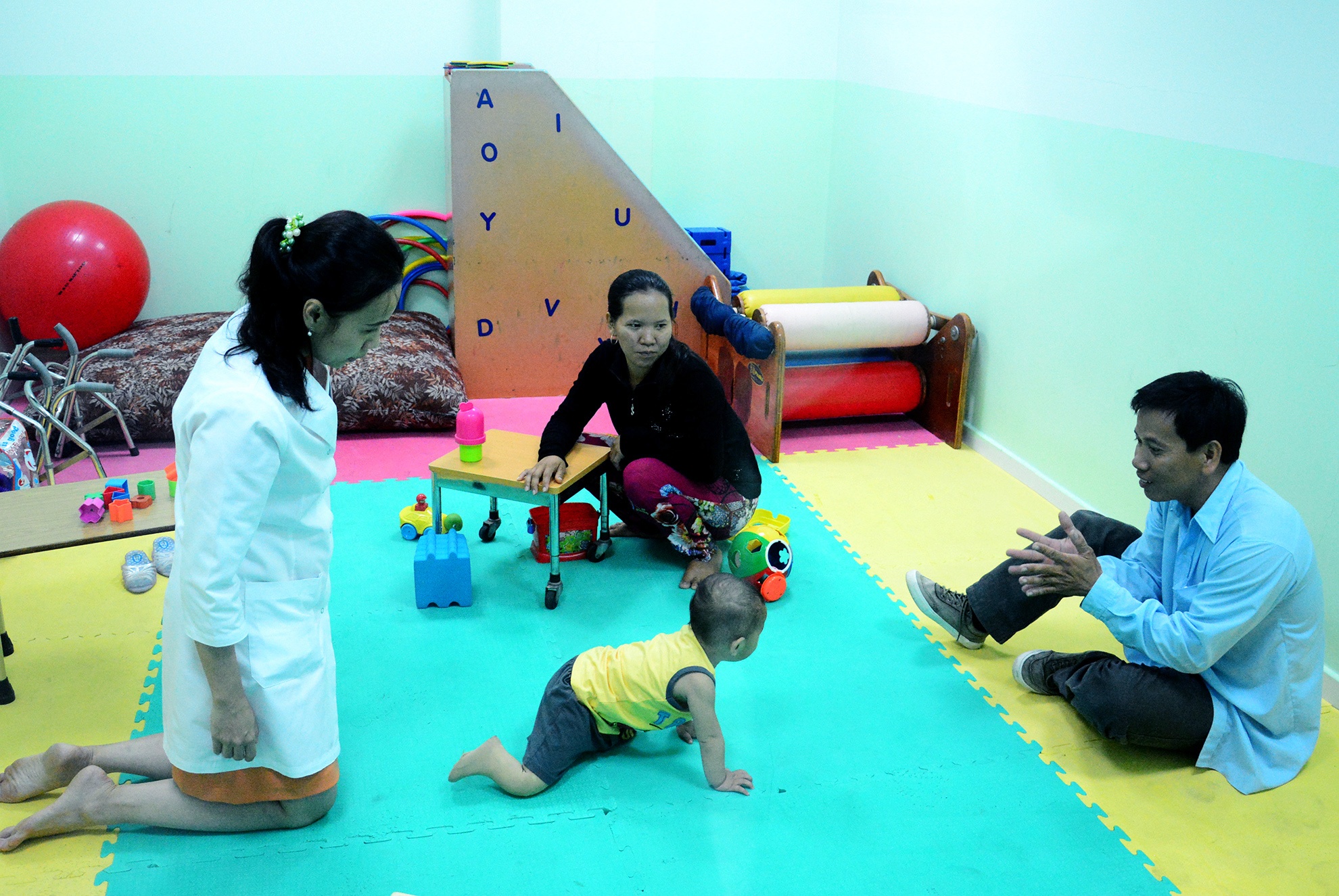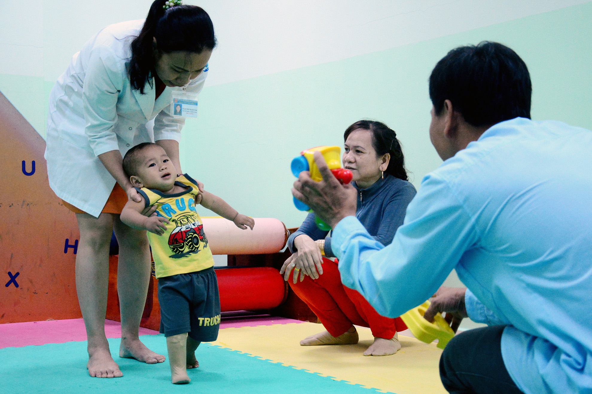 Ông Lê Tường Giao, cử nhân vật lý trị liệu, Trưởng khoa Vật lý trị liệu và phục hồi chức năng của bệnh viện hướng dẫn cho bố và người thân bé Huy cách vận động bằng dụng cụ hỗ trợ.