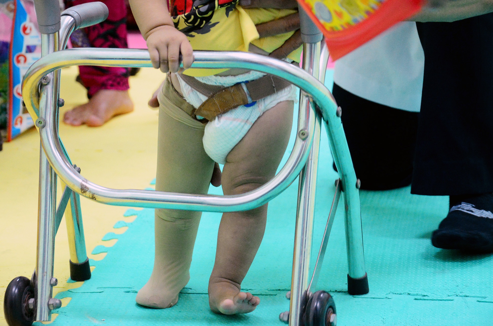 Bé trai bị văng ra khỏi bụng mẹ ở miền Tây quay lại Bệnh viện Nhi đồng 1 tái khám trong chiều 29/9. Sau khi được lắp chân giả, Huy đã bước đi chập chững.