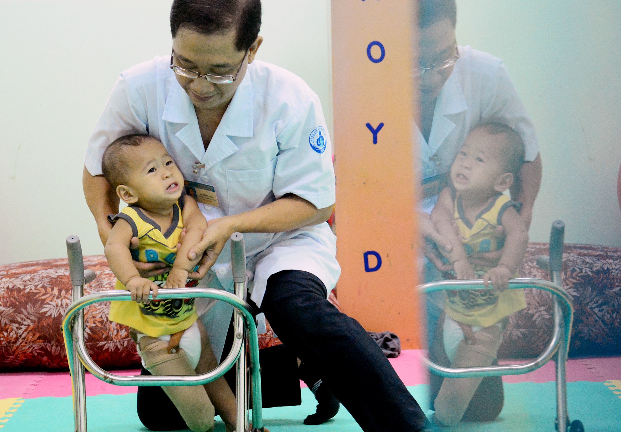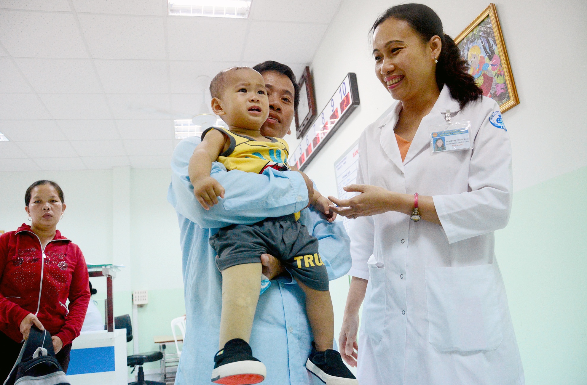 Bác sĩ Tâm kiểm tra bé Huy tập đứng và đi bằng chân giả.