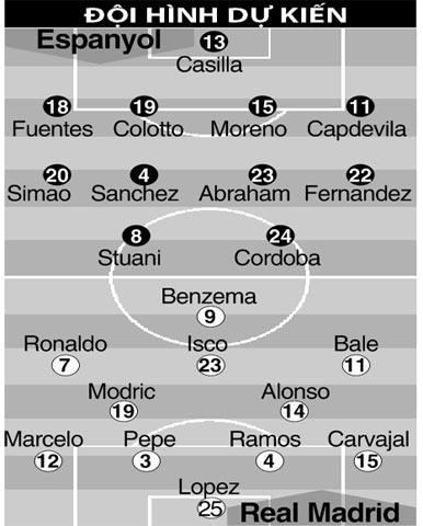 Espanyol cần phải biết rằng, chỉ 8 trận gần đây trong khuôn khổ La Liga, Real đã có được 31 bàn thắng. Trong đó riêng một mình Ronaldo ghi 12 bàn. Sẽ không có gì ngạc nhiên nếu ở trận này, Real Madrid sẽ thi đấu với 3 gọng kìm trên hàng công, gồm Benzema, Bale và Ronaldo. Đây là bộ ba đã ghi tổng cộng 36 bàn cho Real Madrid tại mùa giải năm nay, trong đó Ronaldo đóng góp 20 bàn – chỉ kém 2 pha lập công so với thành tích ghi bàn của cả đội Espanyol tại La Liga 2013/14.