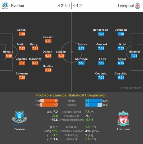 Tính tới phút 80 của trận derby Merseyside, cặp tấn công Suarez – Sturridge đã ghi 17 bàn thắng cho Liverpool (chiếm hơn 72% số bàn cả đội). Trong đó, Suarez đóng góp 9 bàn, Sturridge có 8 pha lập công.