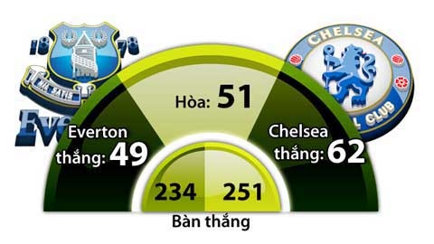 Chelsea đang là đội có thành tích đối đầu tốt hơn khi thắng 62 so với 49 trận của Everton. Tuy nhiên, thời gian gần đây thì Everton không ngán The Blues. Bằng chứng là 13 lần đụng độ gần nhất, Everton thắng 4, chỉ thua 4 và 2 đội hòa nhau 5 lần.