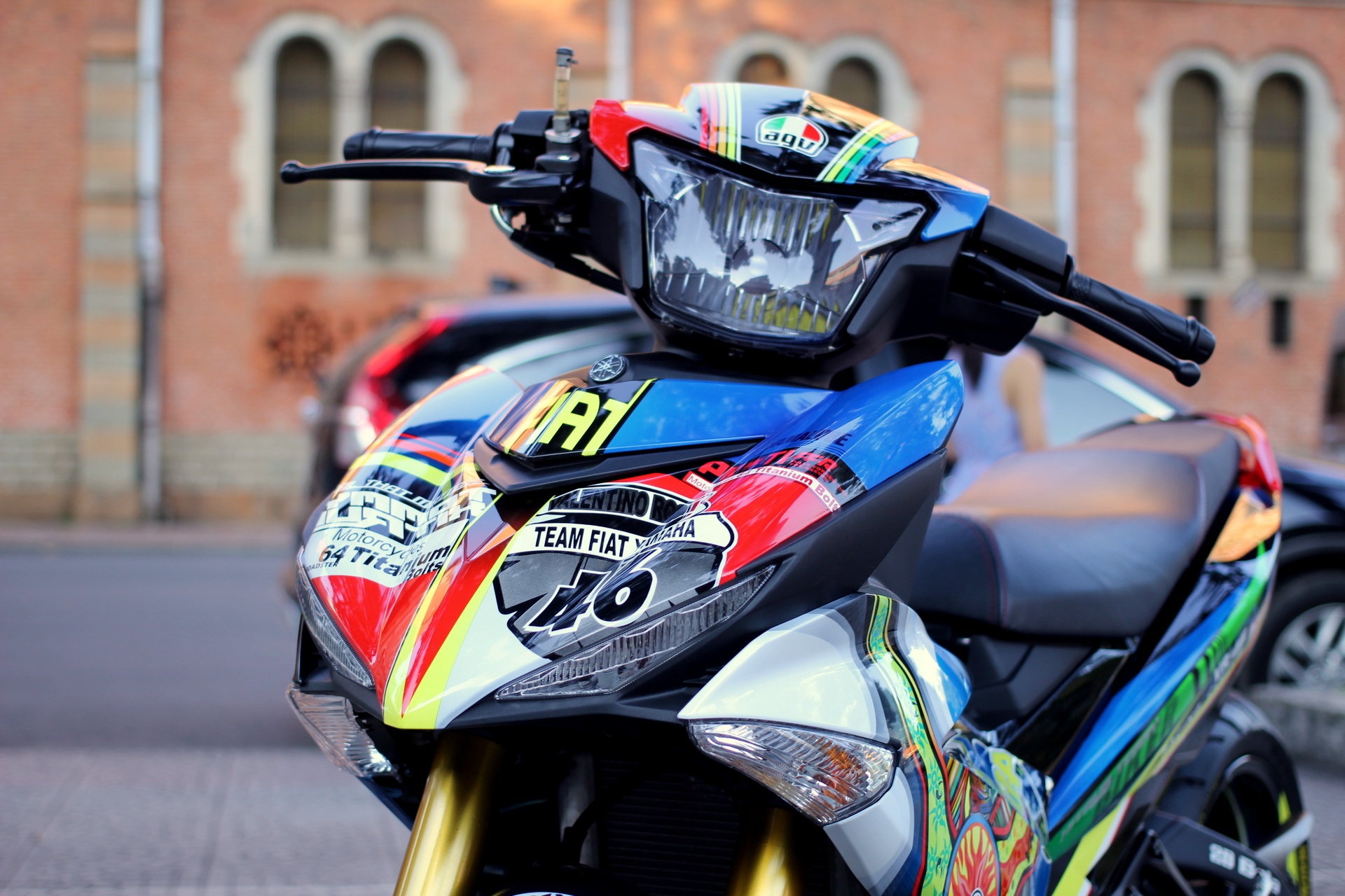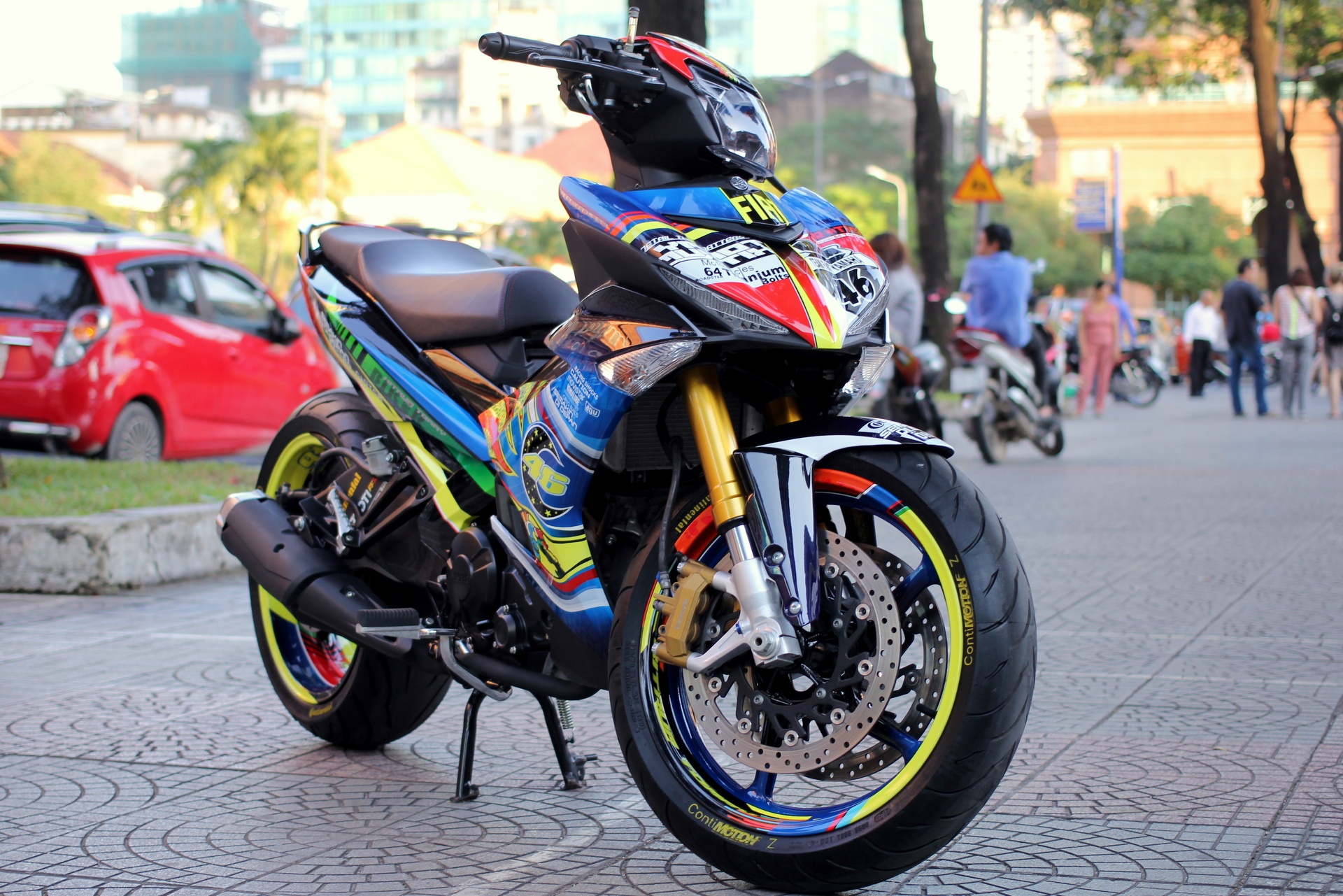 | Đây là chiếc Yamaha Exciter 150 độ, thuộc sở hữu của một người đam mê xe phân khối lớn ở Sài Gòn. Cảm hứng trên bản độ này là dàn tem nhiều màu sắc phong cách xe đua, dàn chân hầm hố lấy từ xe phân khối lớn. |