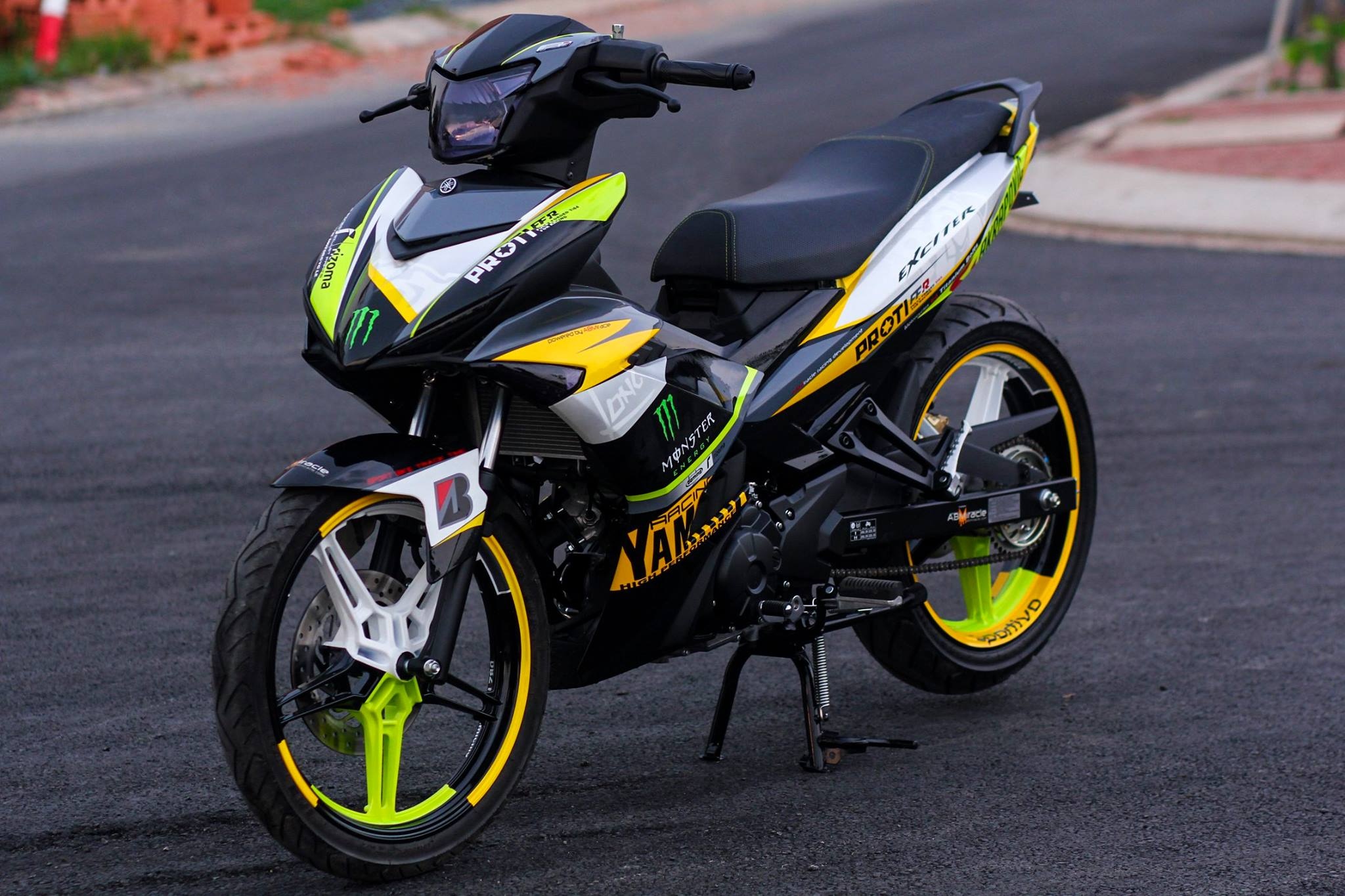 | Chiếc Exciter 150 phiên bản RC màu trắng-đỏ mới chỉ chạy khoảng 30 km. Chủ nhân của nó yêu thích một phiên bản độ Monster ở triển lãm môtô Thái Lan nên đã quyết định độ lại theo ý tưởng này. |