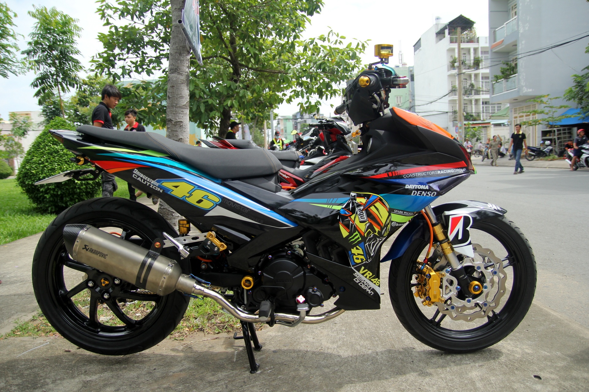 Exciter 150 được khoác lên mình bộ áo mới với màu sơn bắt mắt theo phong cách xe đua cùng những món đồ chơi hàng hiệu.