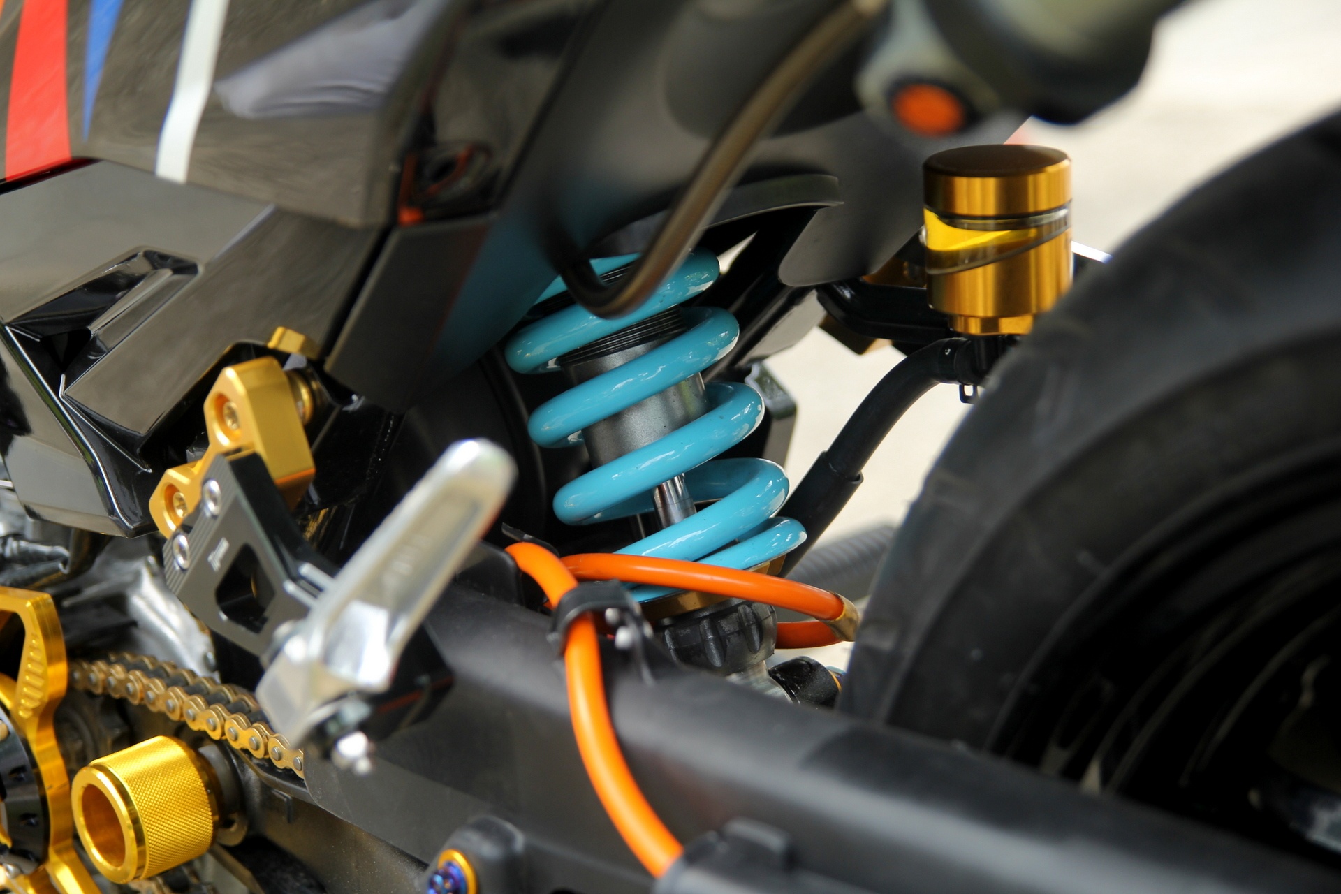 | Phuộc sau kiểu monoshock sơn màu xanh, bên trong là hệ thống ống dẫn dầu, bình dầu cho phanh sau. |