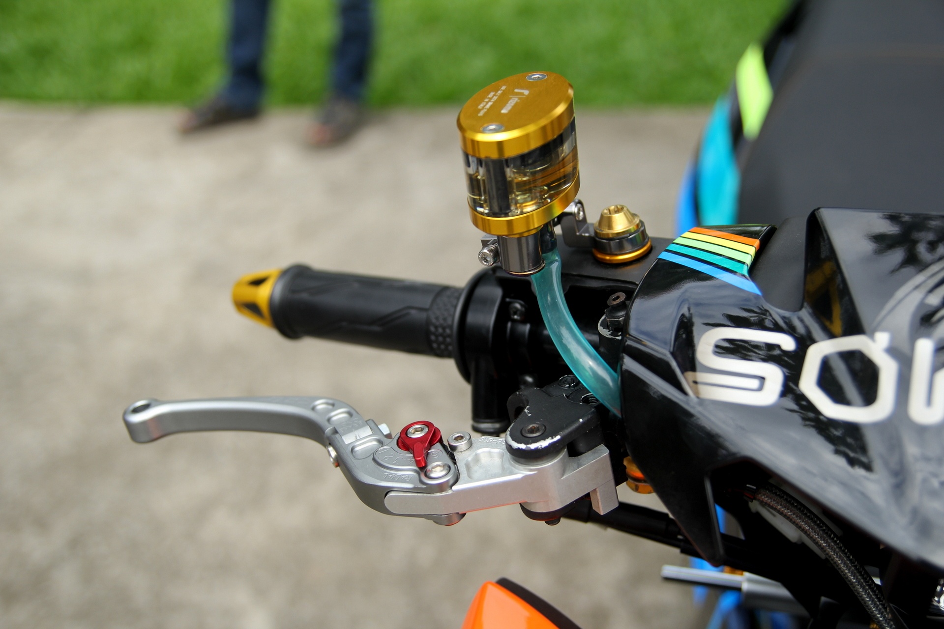 | Phía trước gắn bình dầu Rizoma, tay phanh, tay côn 6 số hiệu Radial. |