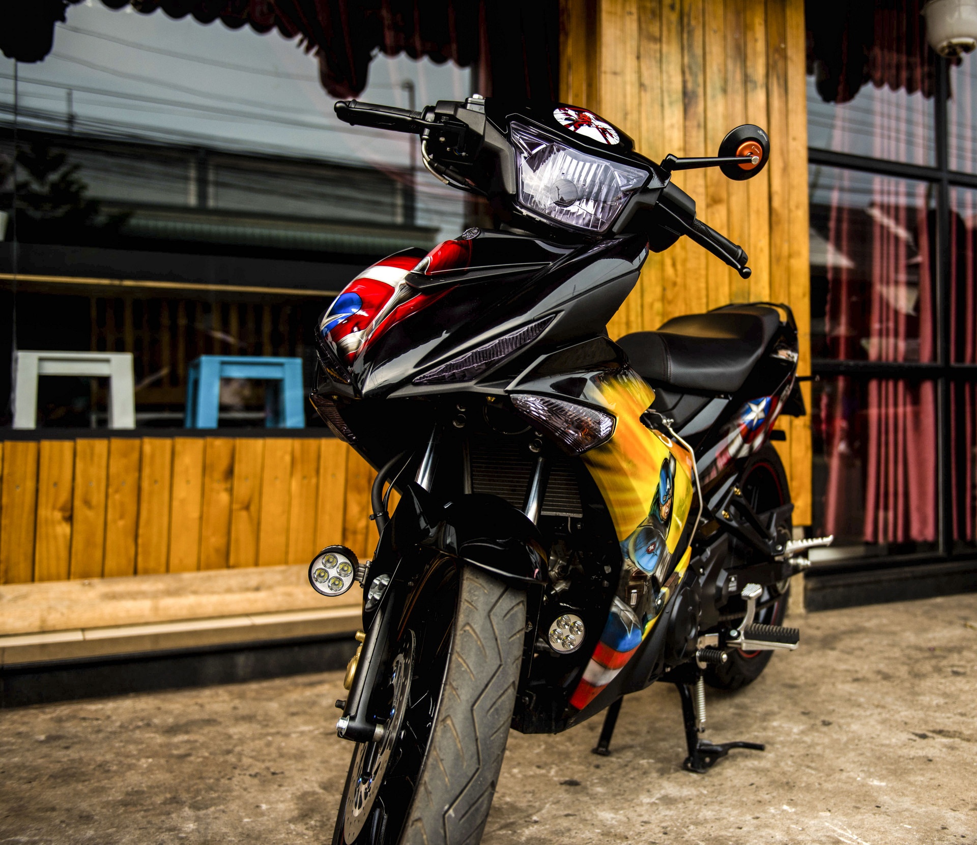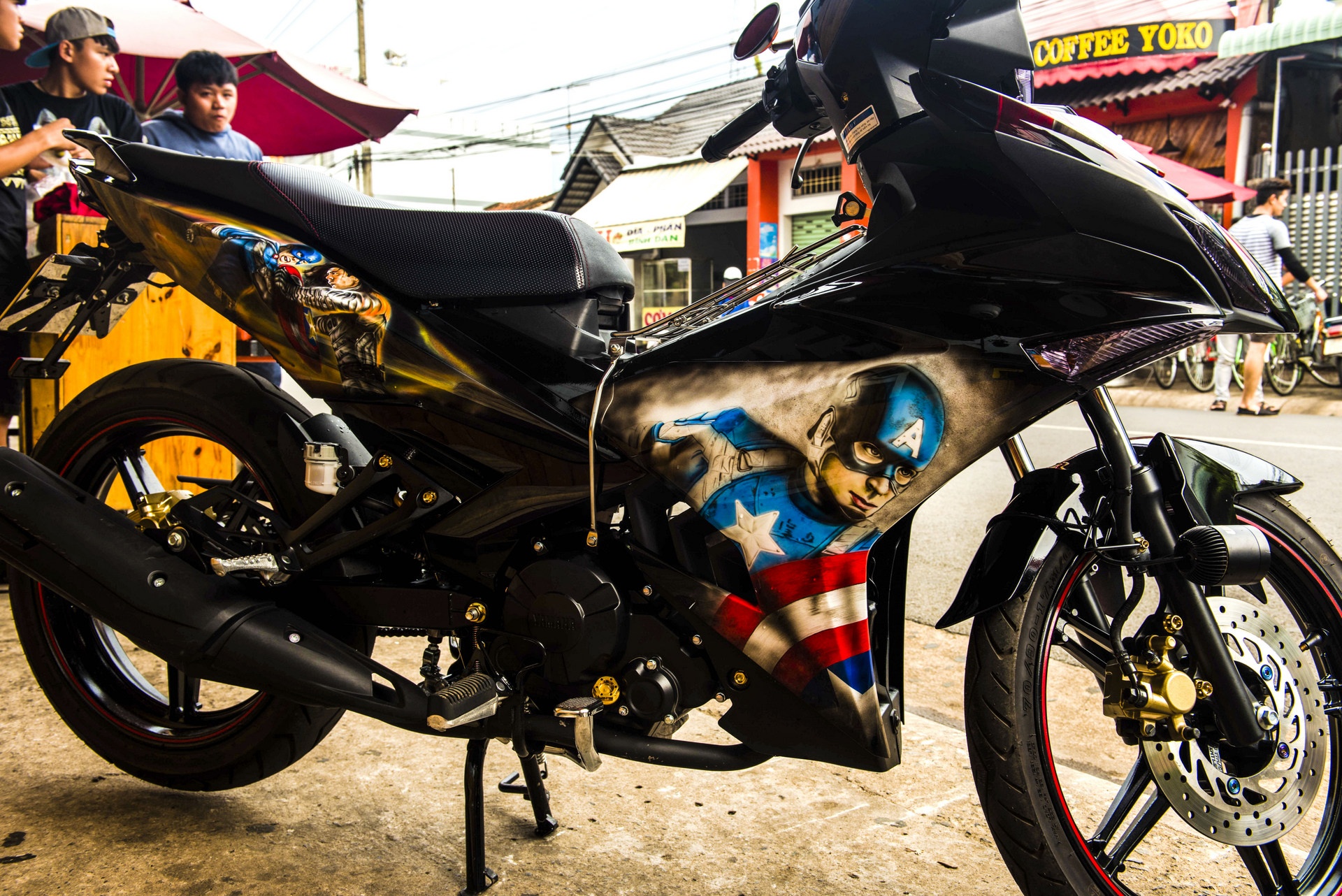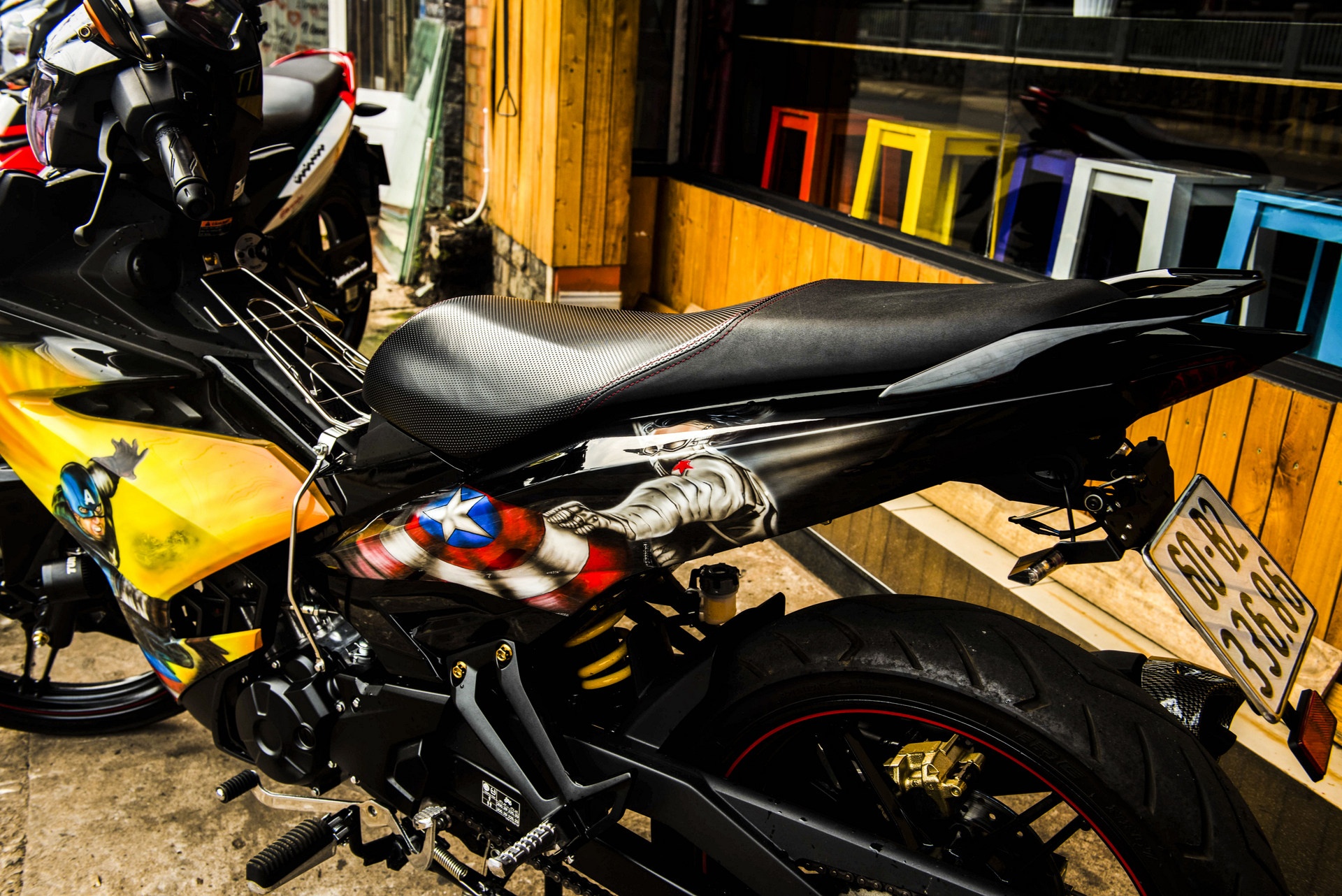 | Exciter 150 là mẫu xe côn tay được nhiều người quan tâm tại Việt Nam. Rất nhiều phong cách độ dàn áo đã được các biker sử dụng để trang điểm cho chiếc xe của mình, trong đó mới nhất là phiên bản Exciter 150 được trang trí hình Captain America của một người chơi tại TP HCM. |
