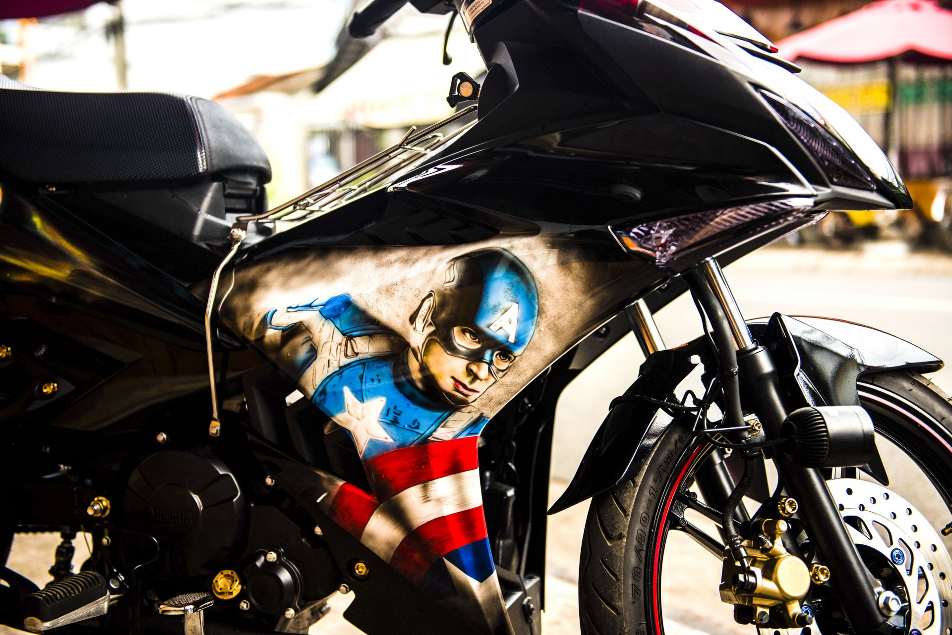 | Hình ảnh người hùng nước Mỹ được vẽ bằng công nghệ airbrush ở hai bên yếm và phía đuôi xe. |