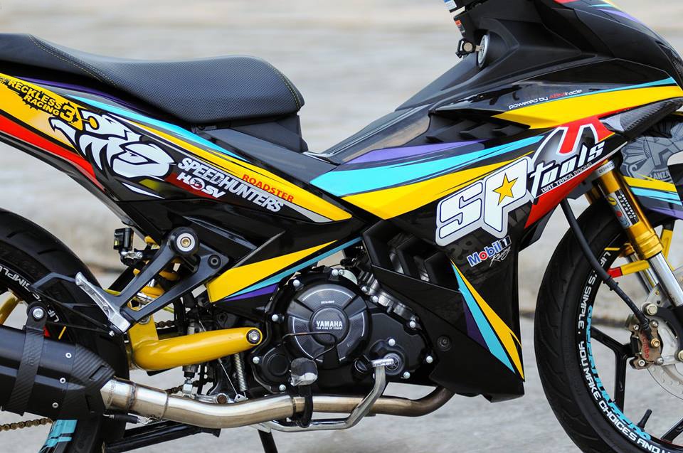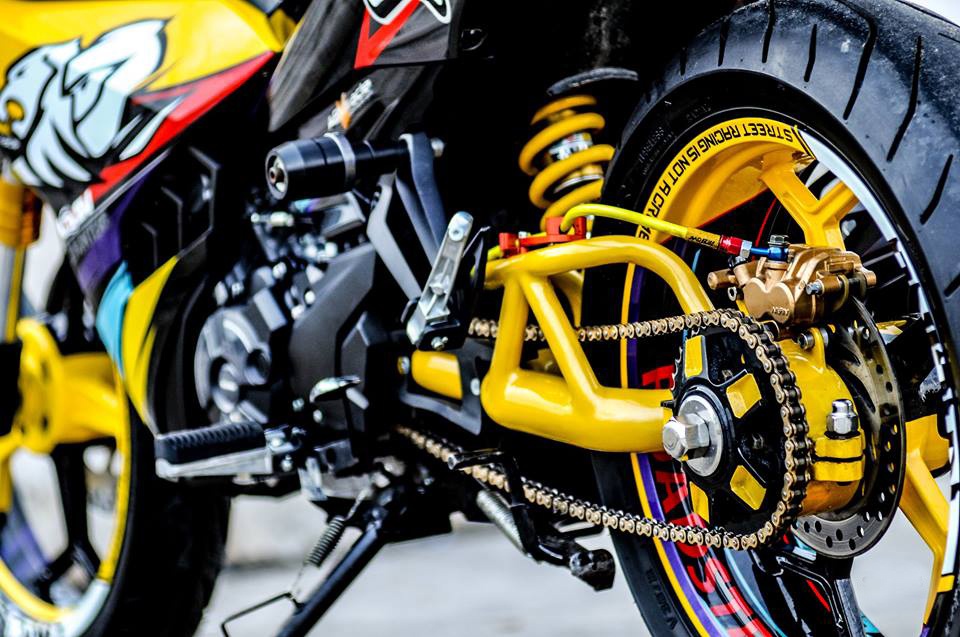 Chiếc xe côn tay sơn tem đấu dàn áo và cặp mâm theo phong cách đội đua Holden Racing Team (Australia) bên cạnh loạt đồ chơi hàng hiệu như pô Mivv, phuộc trước, sau Gazzi.